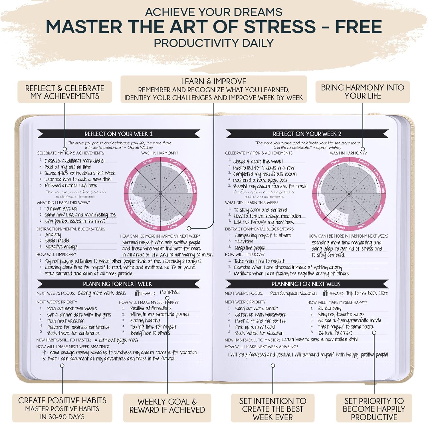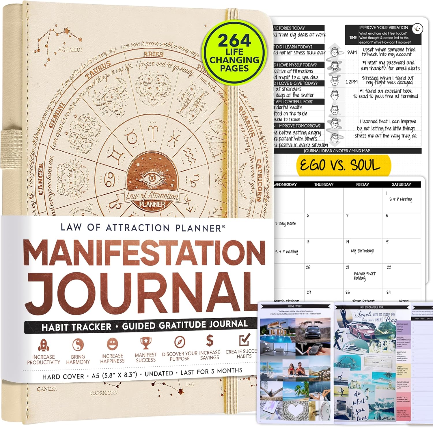 - MANIFESTATION JOURNAL - This deluxe daily planner and gratitude journal for women comes in A5 size (5.8 x 8.3 inches). The life planner comprises 264 pages of thick 100 gsm paper, including 90 daily planning sheets, guiding you on how to become the best possible version of yourself on a mental, physical, and interpersonal level. It's a unique diary based on leading scientific studies proven to increase productivity and happiness. The journal features an out-foldable vision board to help you stay focused, morning and evening power questions, mind maps, reflection pages, habit trackers, a back pocket, and much more than any other planner on the market!