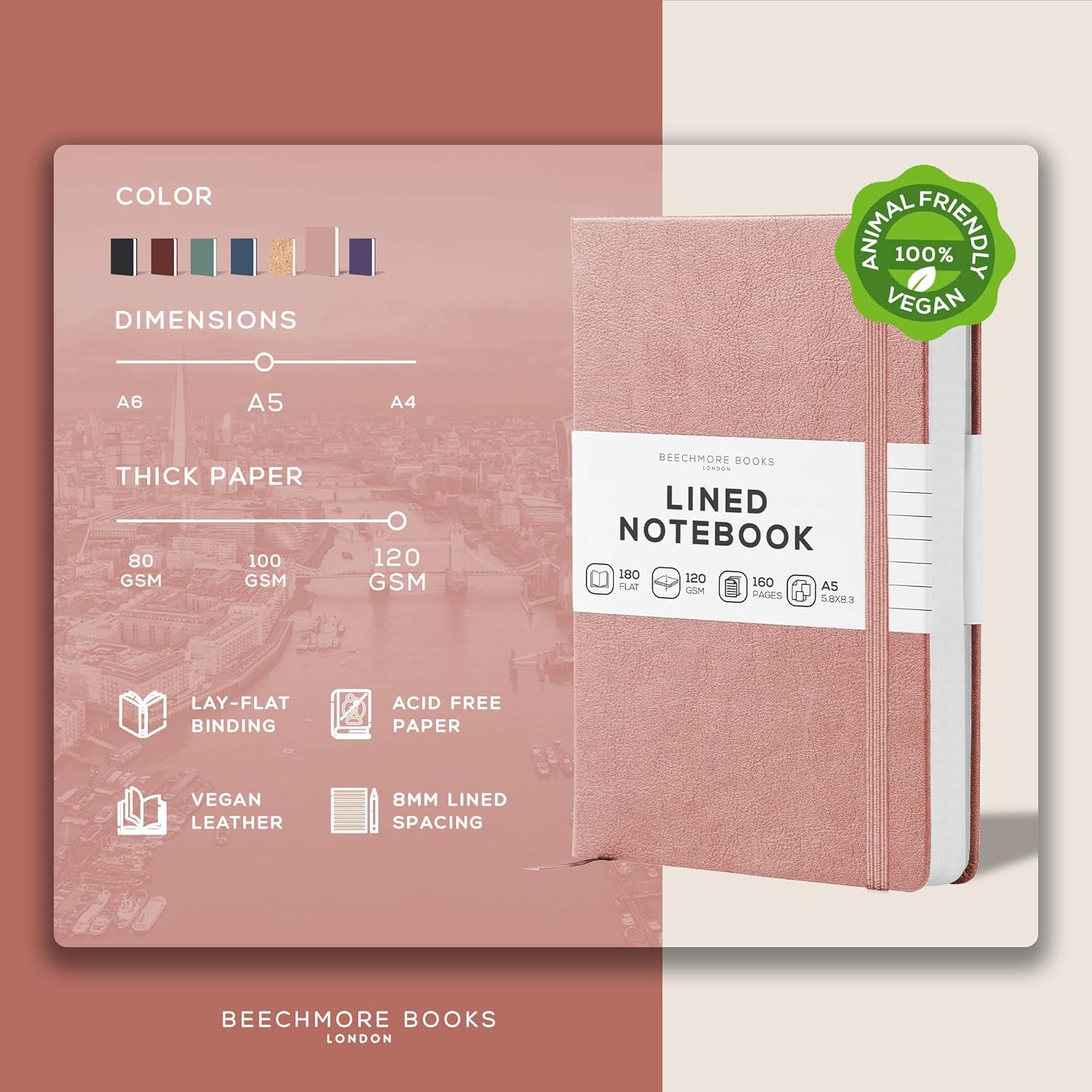 BEECHMORE BOOKS Lined Journal Notebook, 5.8 x 8.3 inch, A5 160 Lined Pages, Hardcover Leather Journals for Women, Men, Writing and Notebooks for Work - 120 GSM Thick Paper, Gifts Box Included