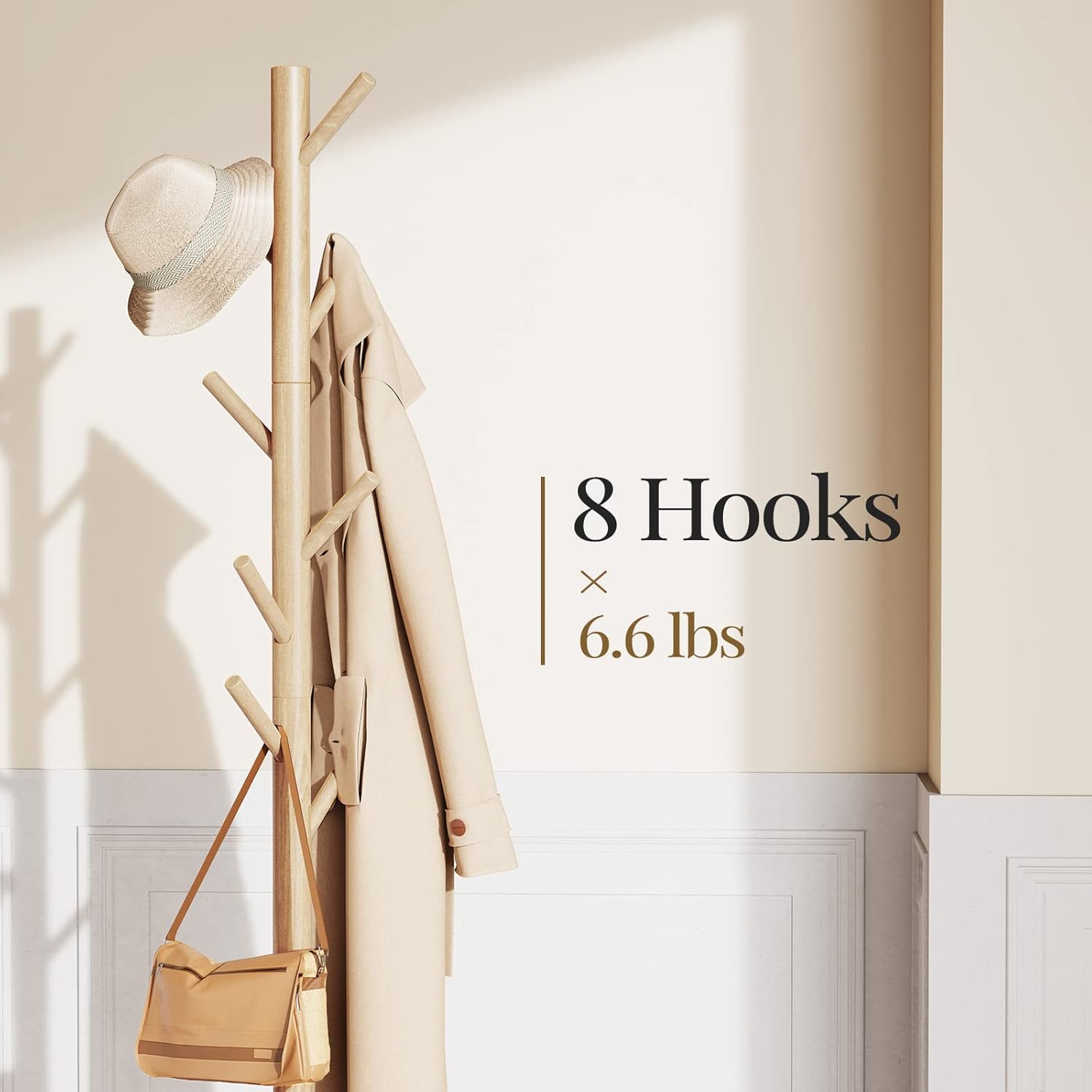 Pipishell Coat Rack Sturdy Wooden Coat Rack Stand, Adjustable Coat Tree, Free Standing Tree Hanger with 4 Sections & 8 Hooks, for Home/Bedroom/Office/Hallway/Entryway