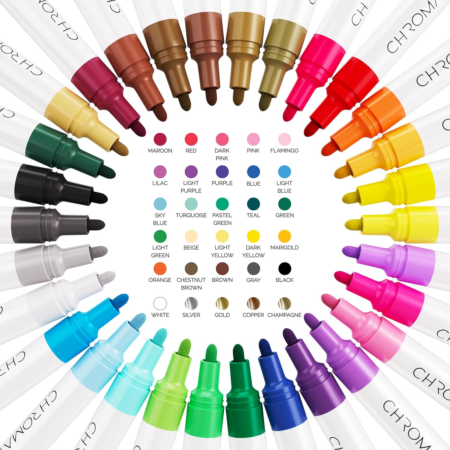 CHROMATEK Dual Tip Oil Based Paint Markers - 30 Colors Permanent Paint Pens for Rock Painting, Canvas, Glass, Wood, Stone & DIY Art Supplies - Quick Drying Waterproof Pen with Video Tutorials & Ebook