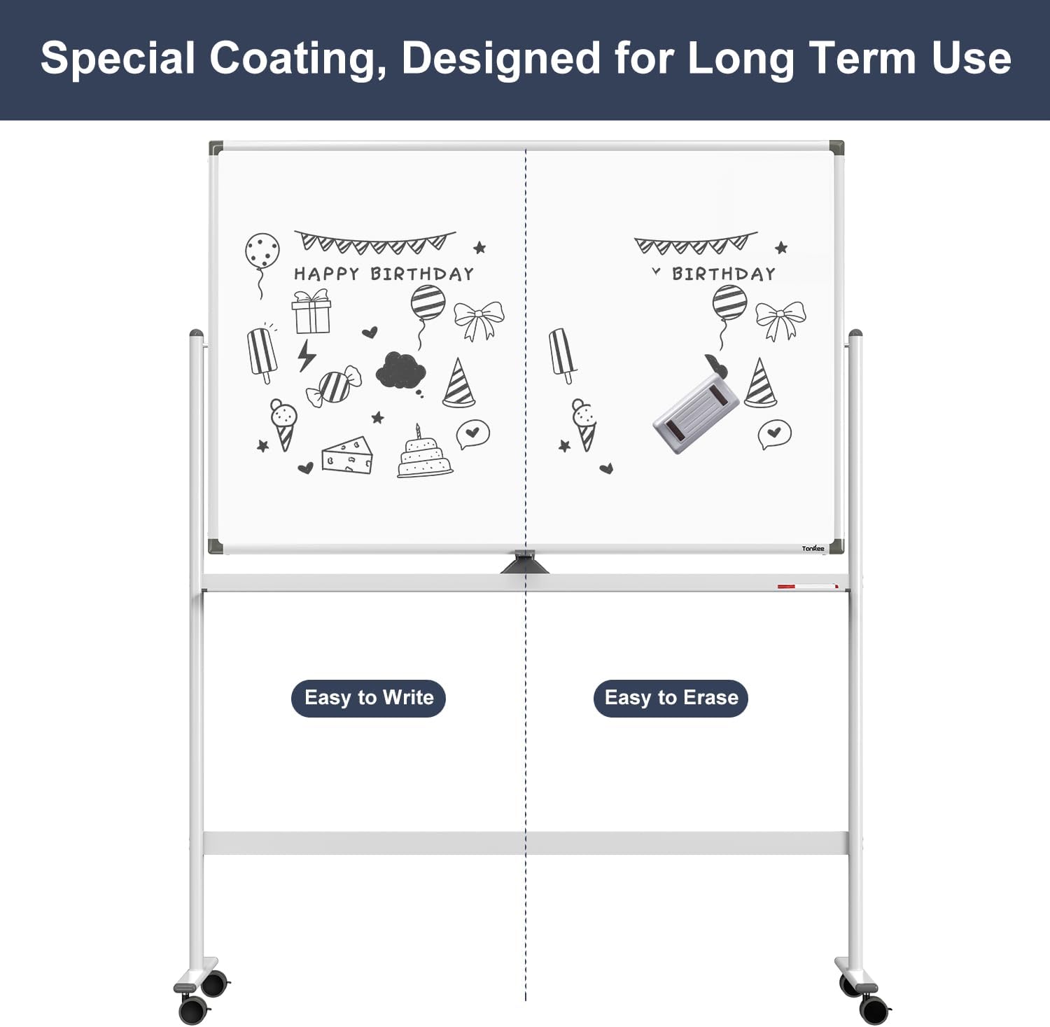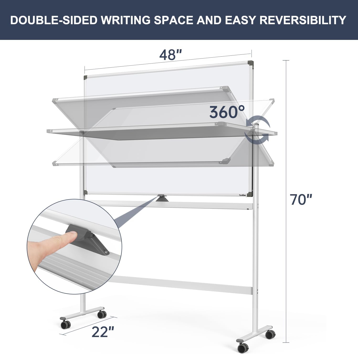 - DUAL SIDED FOR MULTIPLE USES - 48" x 32" white board is capable of being rotated 360 degrees and can be locked into place to prevent movement. Twice space of a wall mounted whiteboard with this reversible dry erase board. Effectively take notes and teach with TANKEE mobile whiteboard. Use for office settings, or training sessions, conventions, parties, classroom, school, scout camps and outdoor activities.