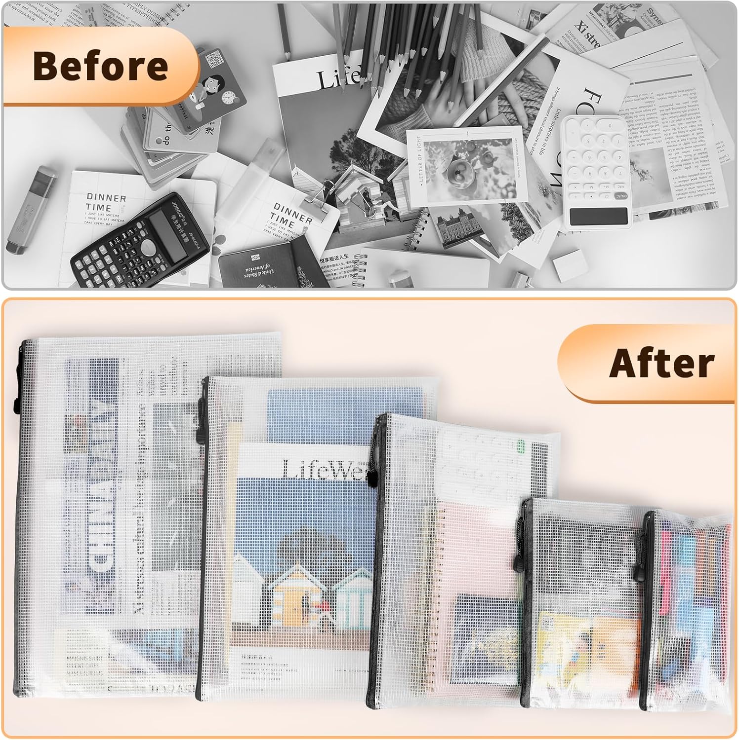 - Translucent Design: The translucent plastic zipper bag can prevent the privacy of important documents from leaking, but still can identify what the stuff in the bags.