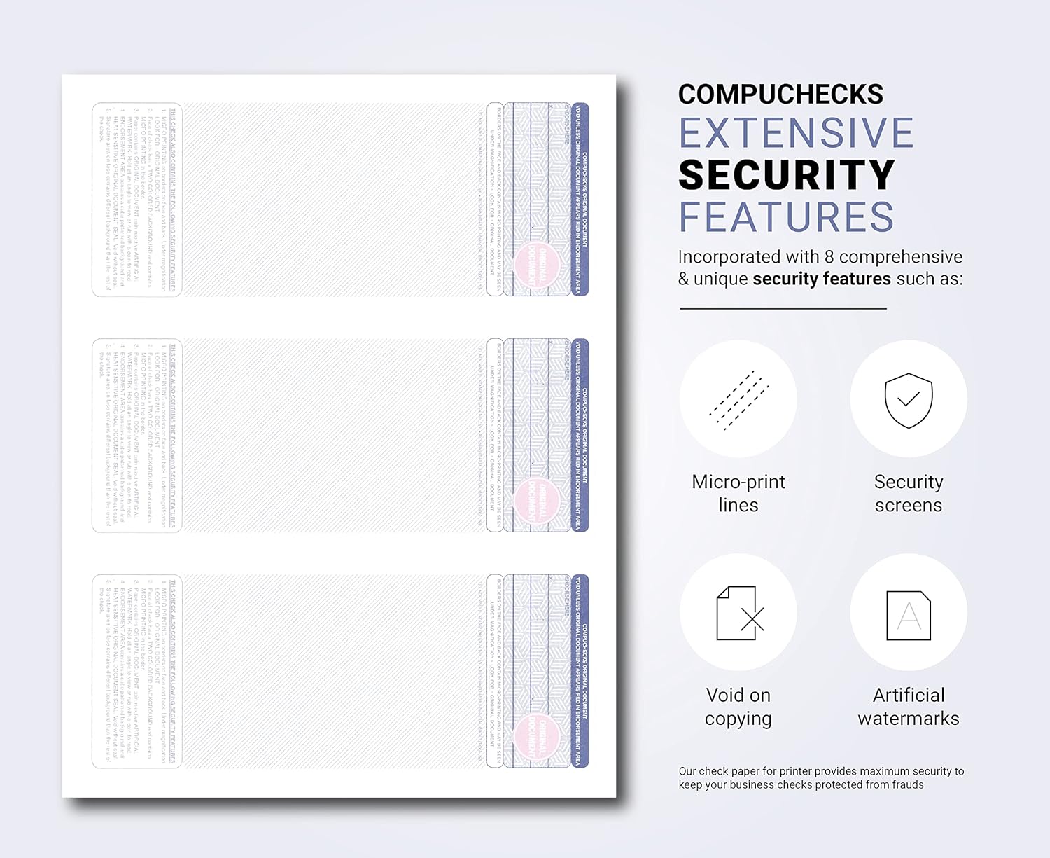 - ADVANCED ANTI-FRAUD PROTECTION: The blank check papers incorporate multiple anti-fraud security features such as micro-print lines, security screens, and artificial watermarks, and other high-security features, making it hard to copy by fraudsters.