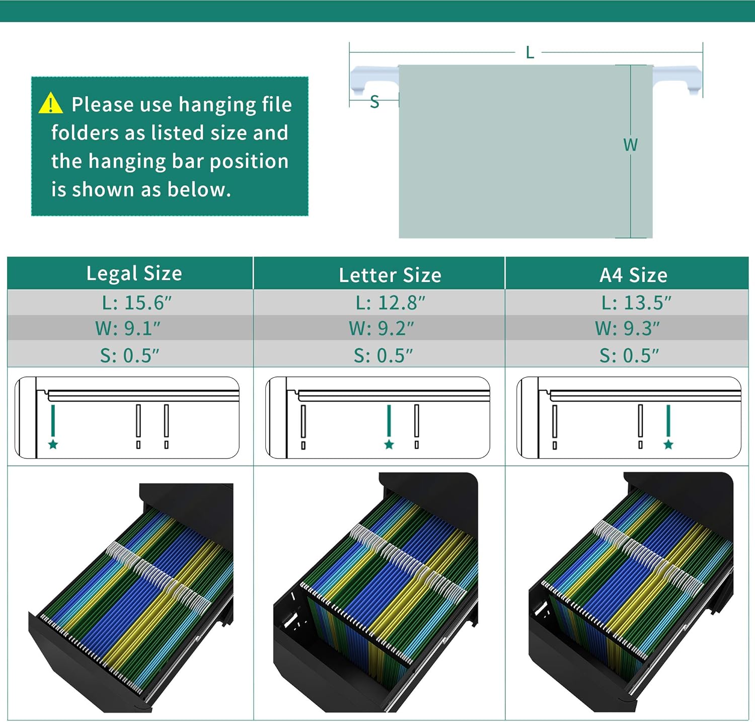 - 【Premium Drawers】The top drawer contains a removable pencil tray, while the bottom drawer features a removable hanging file bar that accommodates letter, legal, and A4 size documents; Keep your files organized