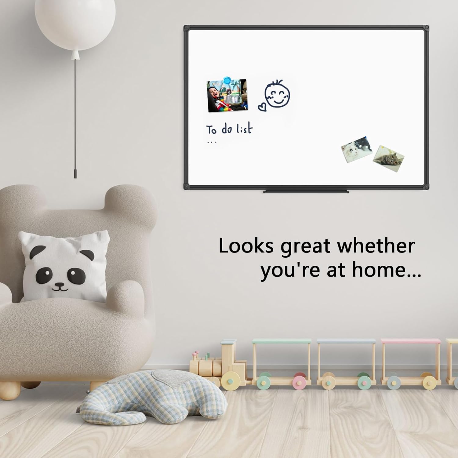 - ELEGANT BLACK ALUMINUM FRAME: Anti-Scratch satin black aluminum frame & detachable marker tray, Round nylon corners, Sturdy whiteboard structure perfect organizer for school home and office.