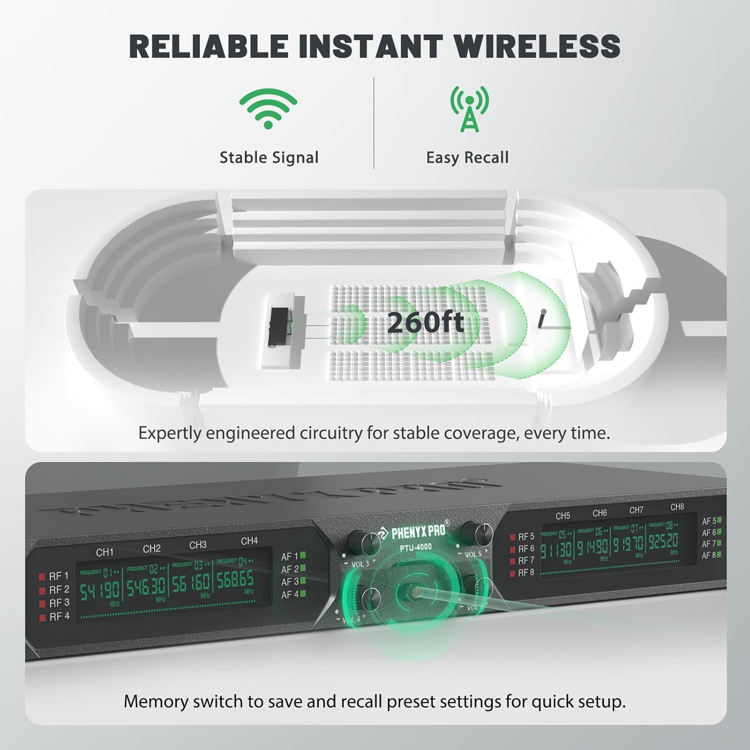 Phenyx Pro Wireless Microphone System, 8-Channel UHF Cordless Mic with Metal Handheld Wireless Mics, Fixed Frequency Dynamic Microphone for Karaoke,Church,Singing,DJ,260ft Range (PTU-4000-8H)