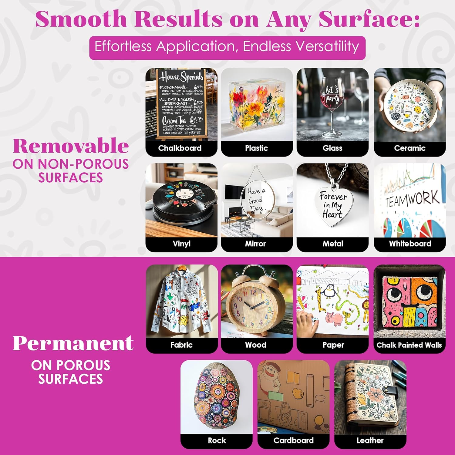 - Easy Clean & Erase: Wipe these chalkboard markers erasable clean with a damp cloth on non-porous surfaces without ghosting. Note: may stain porous surfaces. Make holiday messages pop on blackboards or use these chalk pens for chalkboard as erasable chalk markers for windows and glass