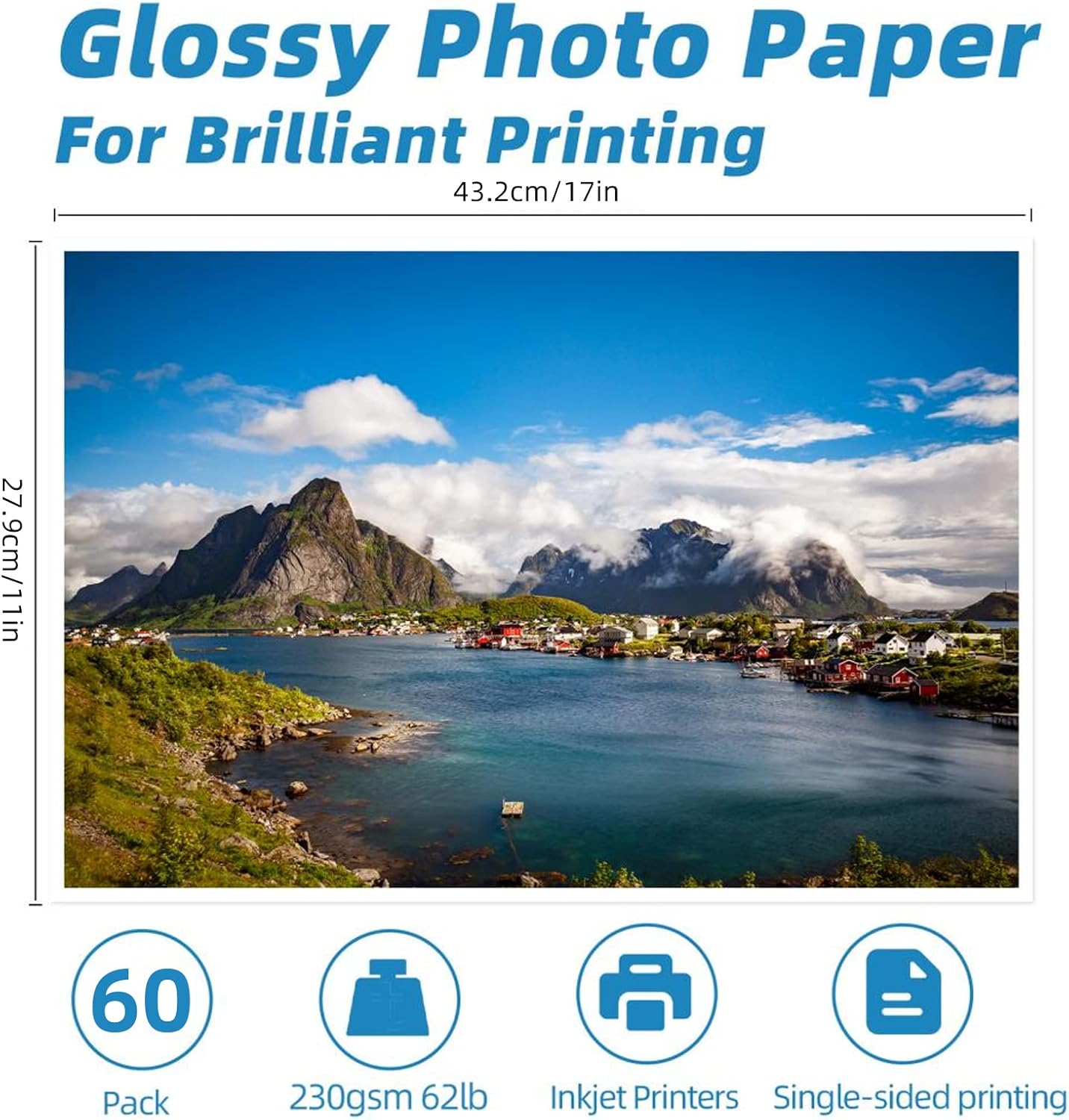 Uinkit 11 x 17 Thick Photo Paper Glossy 11x17 60Sheets 62lb Inkjet Heavyweight 230gsm Gallery show Brochure Pictures Funeral Bulletin Obituary Papers Obituaries Gloss Papers