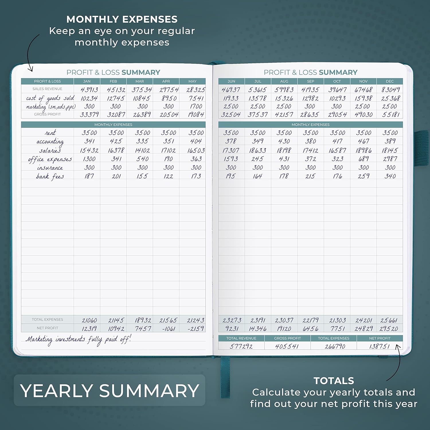 - COMPACT A5 FORMAT & DURABLE DESIGN: This bookkeeping record book comes in A5 format (5.8 by 8.3 inches) and has an eco-leather hardcover, 120gsm no-bleed paper, elastic, pen loop, bookmark, pocket for notes, and a user guide.