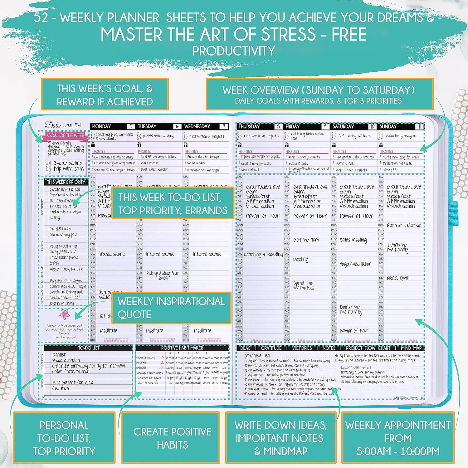 - INCREASE PRODUCTIVITY AND HAPPINESS - This is a deluxe life goal planner showing you how to become the best possible version of yourself on a mental, physical & interpersonal level using the law of attraction vibration guide. This planner is a daily planner, monthly planner, weekly planner, productivity planner, goal planner, business planner, to do list planner, planner notebook & gratitude journal all-in-one.