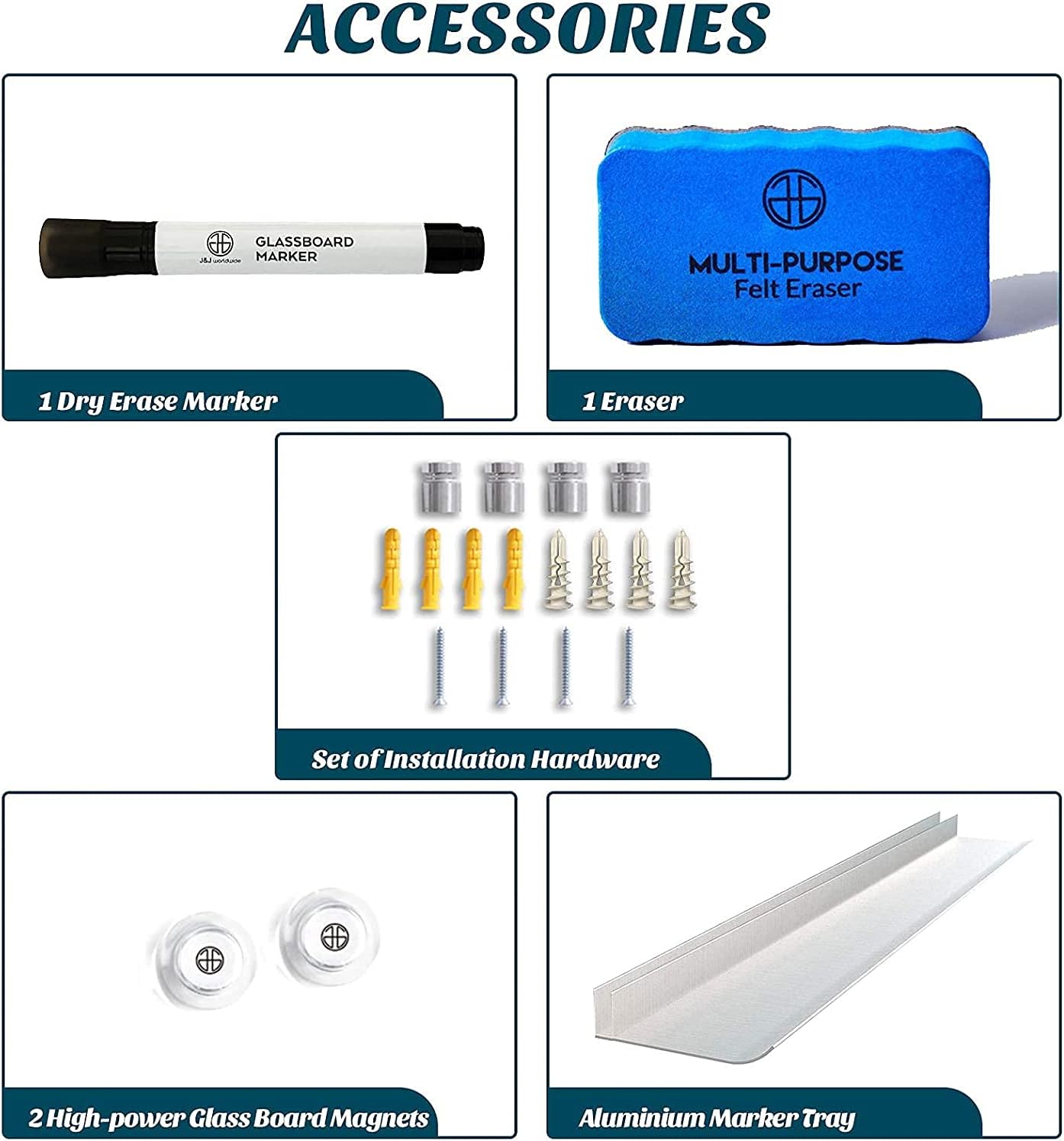 - 【ACCESSORIES INCLUDED】: 4 dry erase markers, 4 magnets, 1 glass whiteboard eraser, 1 removable aluminum marker tray for mounting. One-stop shopping. t's a great gift idea for your workmate, boss or spouse which can enhance the office/ house atmosphere