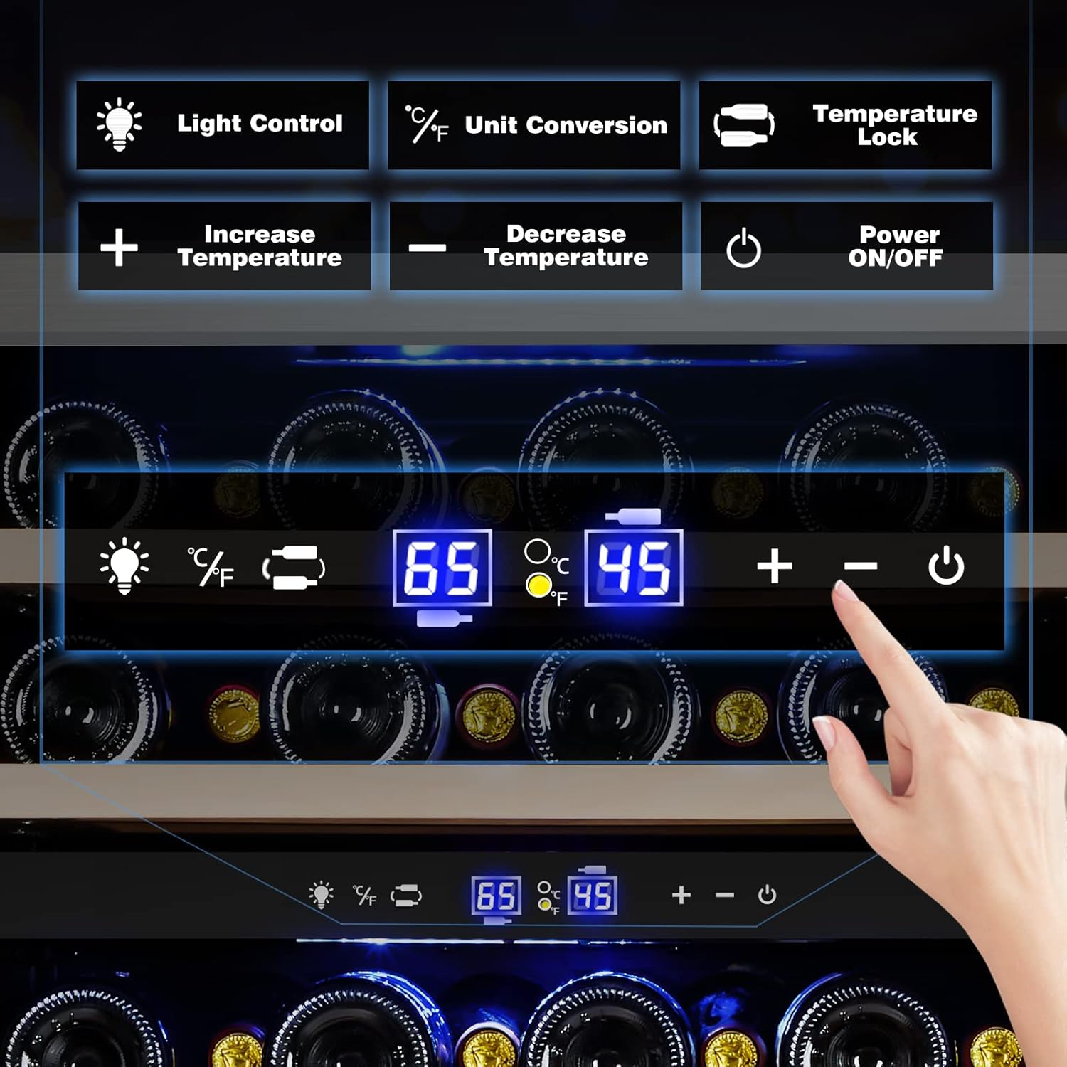 - 【Dual Zone Wine Cooler】This dual zone wine cooler is a unique design that addresses the hassles of storing diverse wine collections, It can accommodate larger bottles, such as Champagne. The upper zone ranges from 40 F to 55 F while the lower zone is between 55 F to 65 F.