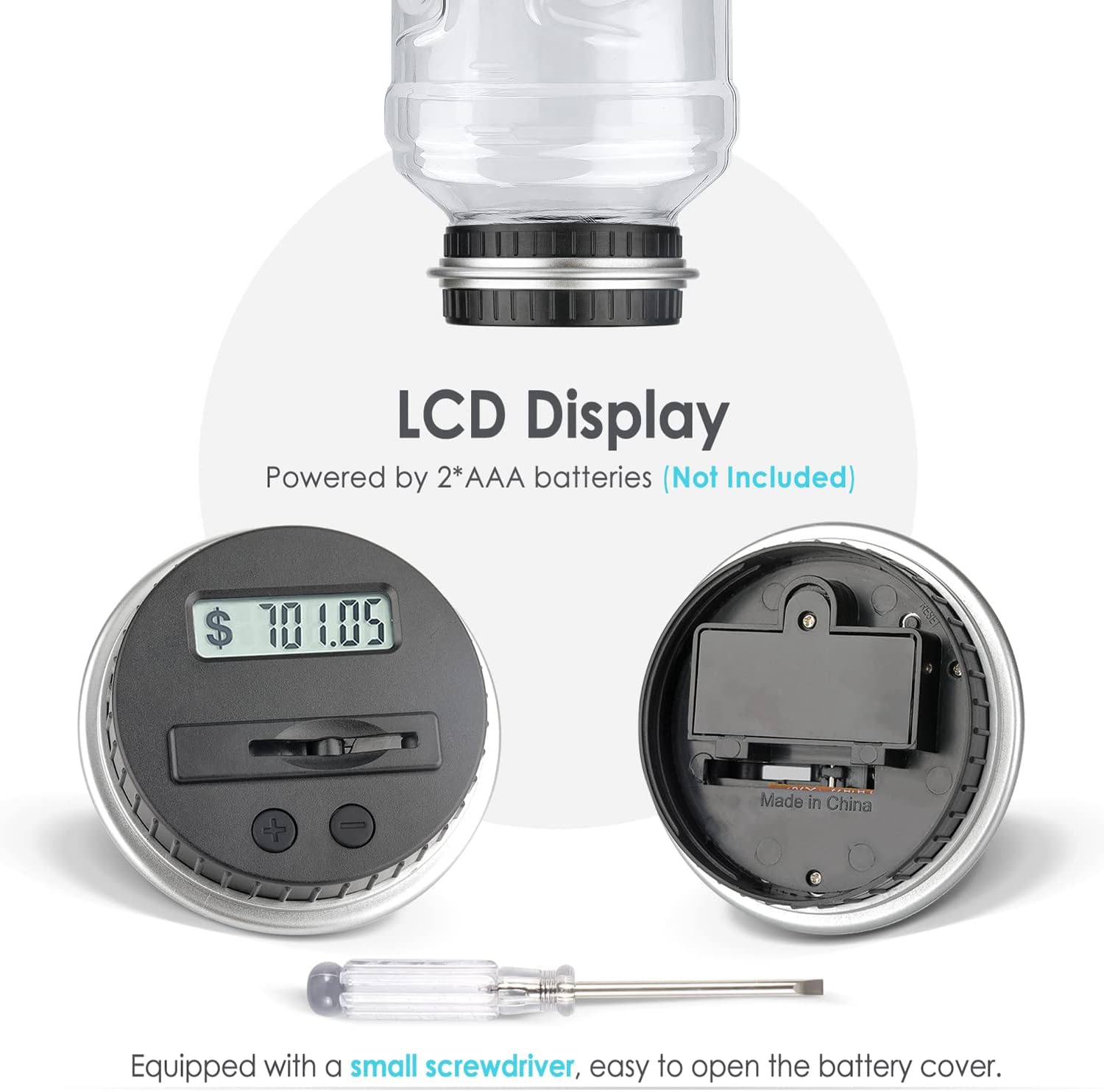 - Designed For All US Coins: Large capacity up to 1.8L, digital counting money jar can storage 800-1000 coins. The digital counting coin bank accepts all US coins and is powered by 2 AAA batteries(Not Included).