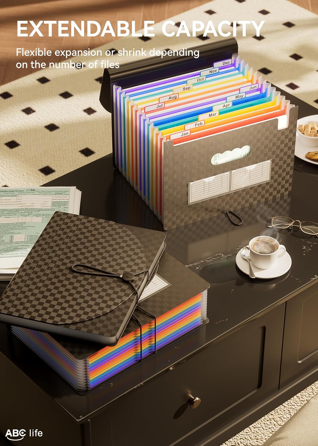 - ✅【12 POCKETS MONTHLY FILE ORGANIZER】ABC life 12 pockets Accordian File Organizer suitable for filing tax and storing important family documents. Product size is 13 "x 9.4"x 14", which can be used to store plenty of Letter/A4 size files.