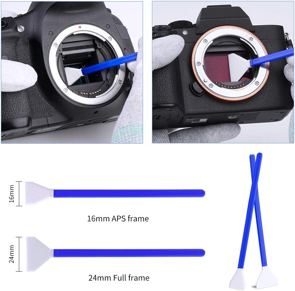 - [Professional Lens Cleaning Kit] ๏ผ Dslr cleaning kit includes Lens Cleaning Pen + Camera Air Blower + Cleaning Liquid + 16mm APS-C Sensor Cleaning Swab*2 + 24mm APS Full Frame Sensor Cleaning Swab*8 + Large cleaning cloth*2 + Small vacuum cleaning cloth*6 + Anti-static gloves*1 + storage bag *1