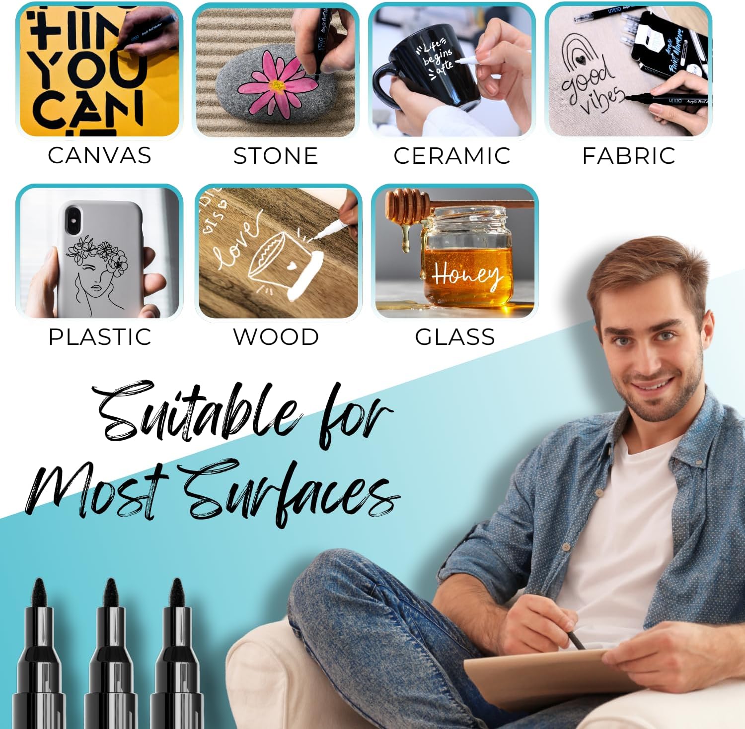 - ☑️ QUICK-DRYING & PERMANENT - Utillo Craft acrylic paint pens are quick-drying and won’t smear, making them ideal for precision tasks like artwork, labeling, and touch-ups. Our paint is waterproof and permanent on porous and smooth surfaces and won't chip or flake like other paint pens.