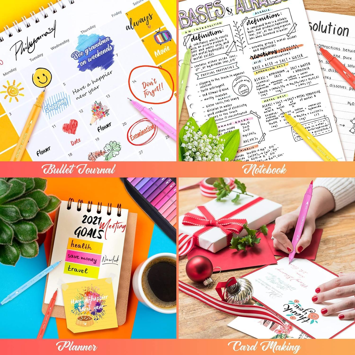- FANTASTIC BRUSH & FINELINER, DUAL-POINT MARKERS: This double-end pen can stimulate your imagination and creativity. The brush pen tip can work well for hand lettering, coloring books, signing, designing, art project, and coloring in large areas. The fine pen tip can be used for sketching, doodling, writing, and intricate coloring books. And this set comes with 4 PCS beautiful Coloring sheet, you can create and color immediately.