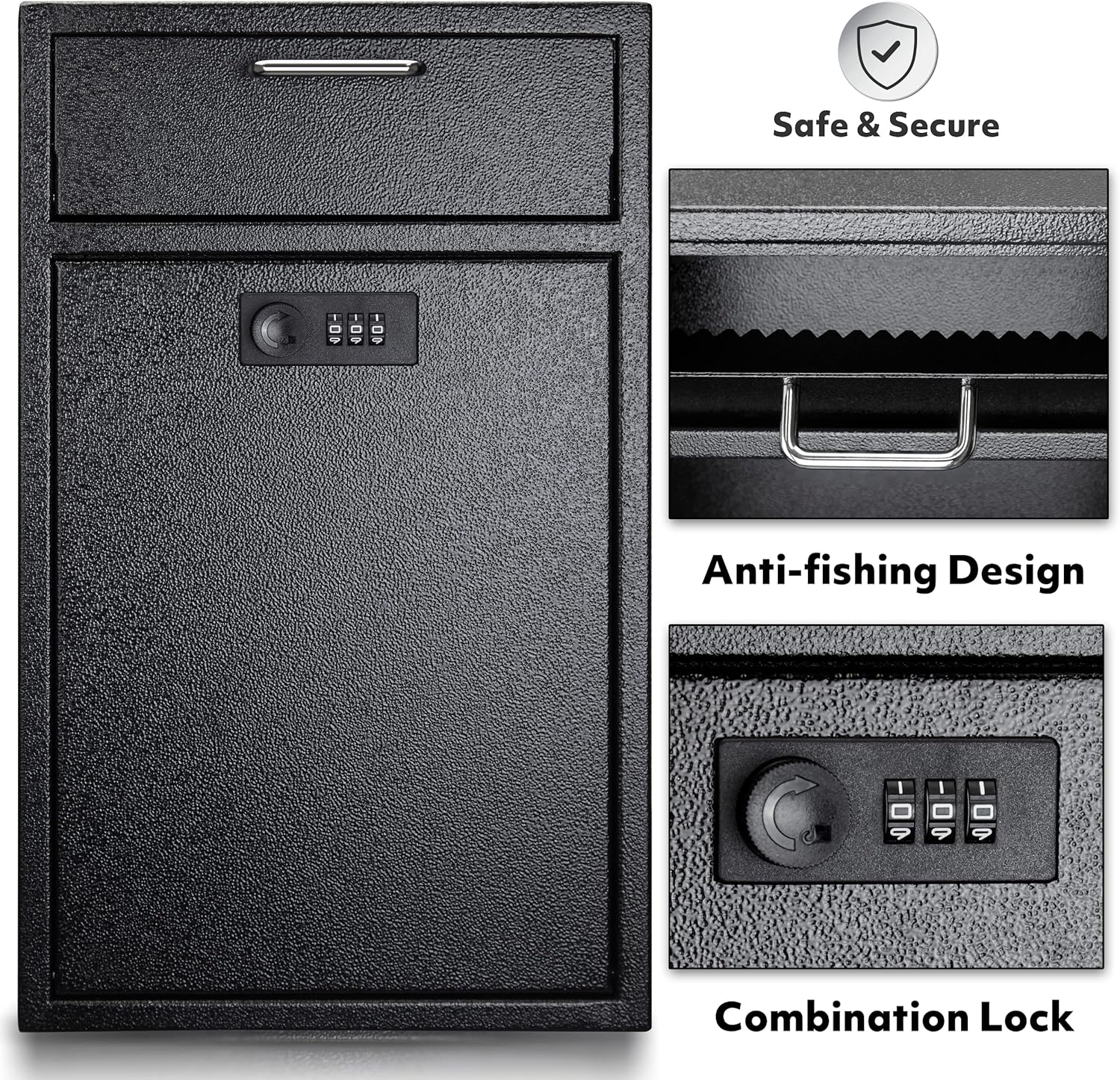 - LOCKED AND ANTI-THEFT: This security dropbox comes with a built-in combination lock, and the anti-fishing design inside makes it impossible for unauthorized personnel to take out the items. Our deposit box with lock will keep your private and important goods safe and secured.