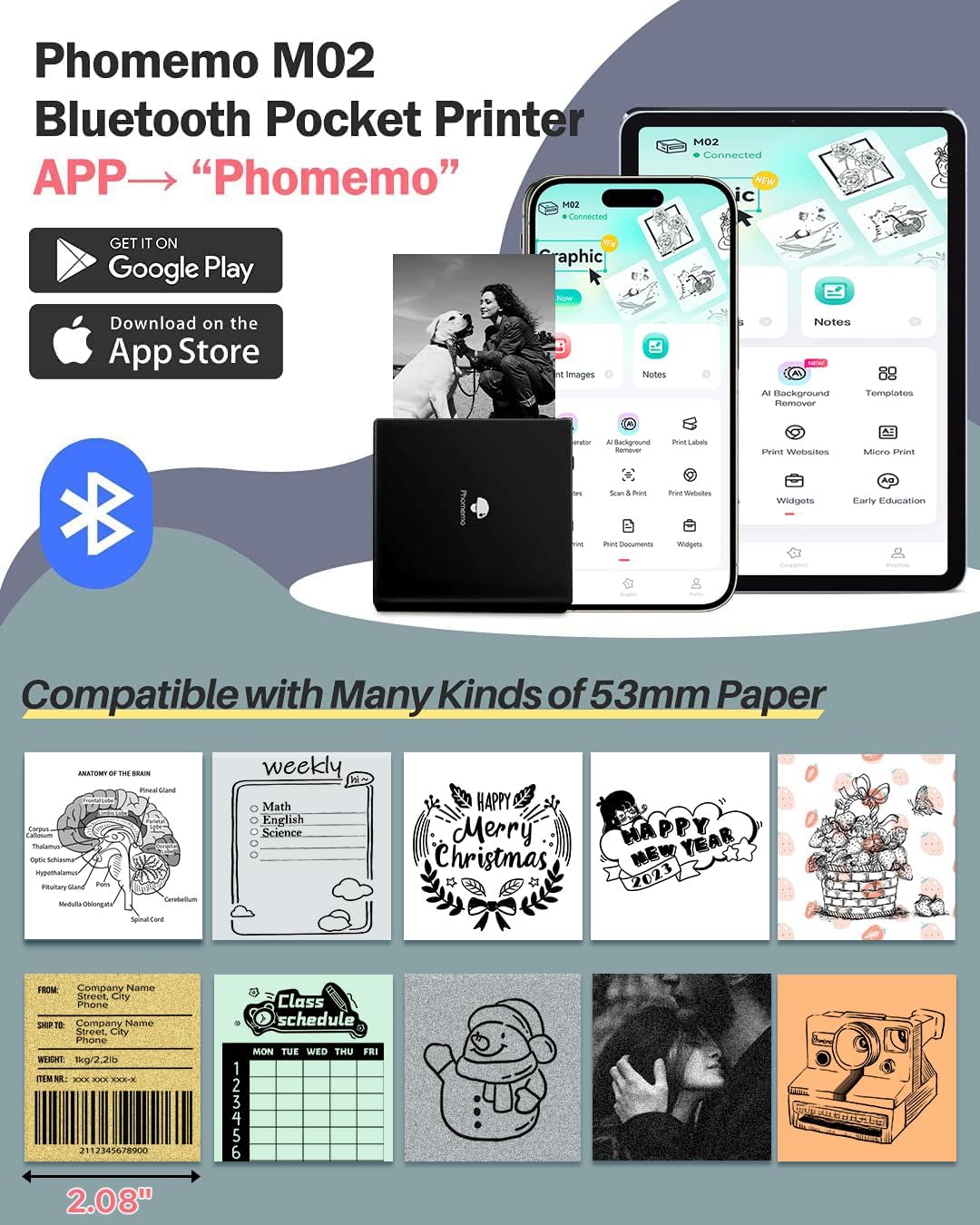 - Multi-Purpose Mini Printer- Phomemo M02 mini sticker printer is suitable for company business, work planner, office assistant, memo, study notes, shopping list, receipts, bookmarks, greeting cards, alphabet learning, coloring and so on. You can use it for DIY, study, fun, labels and create more