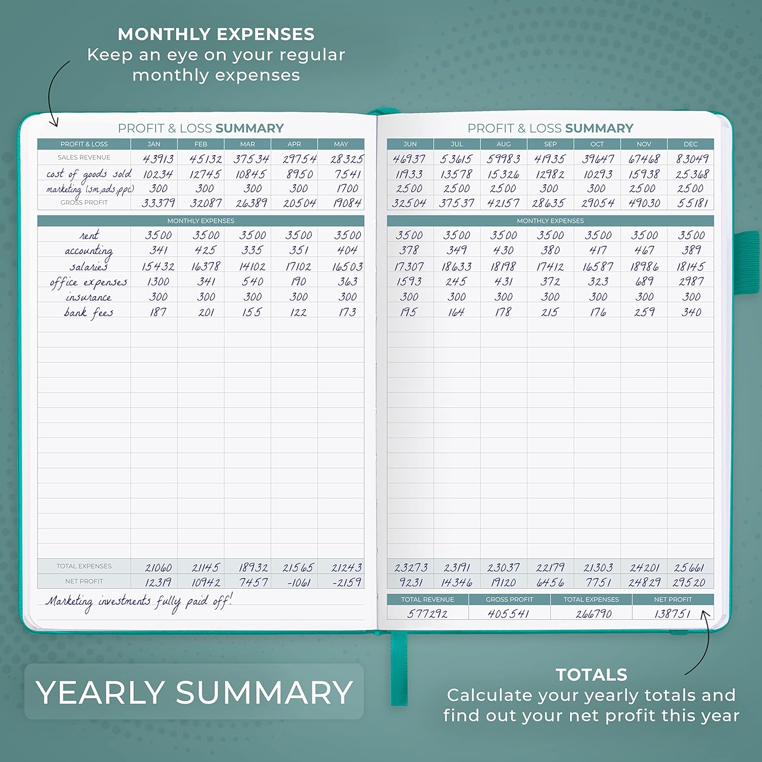- COMPACT A5 FORMAT & DURABLE DESIGN: This bookkeeping record book comes in A5 format (5.8 by 8.3 inches) and has an eco-leather hardcover, 120gsm no-bleed paper, elastic, pen loop, bookmark, pocket for notes, and a user guide.