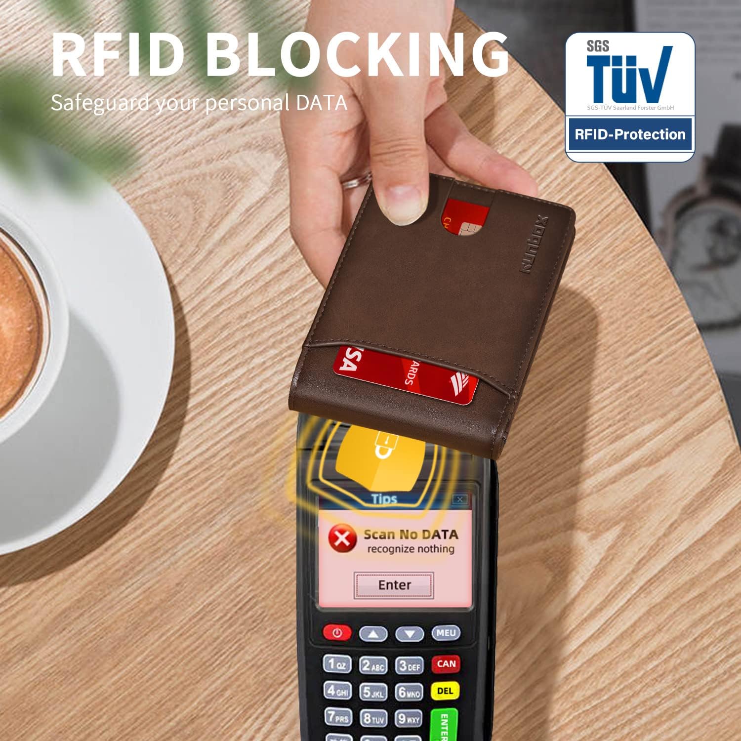 • RFID Blocking - This wallet for men are designed by German designer, made of genuine leather material, durable, wear- resistant and scratch-resistant. Our wallets block the 13.56 MHz band and protect against data theft by RFID scanners