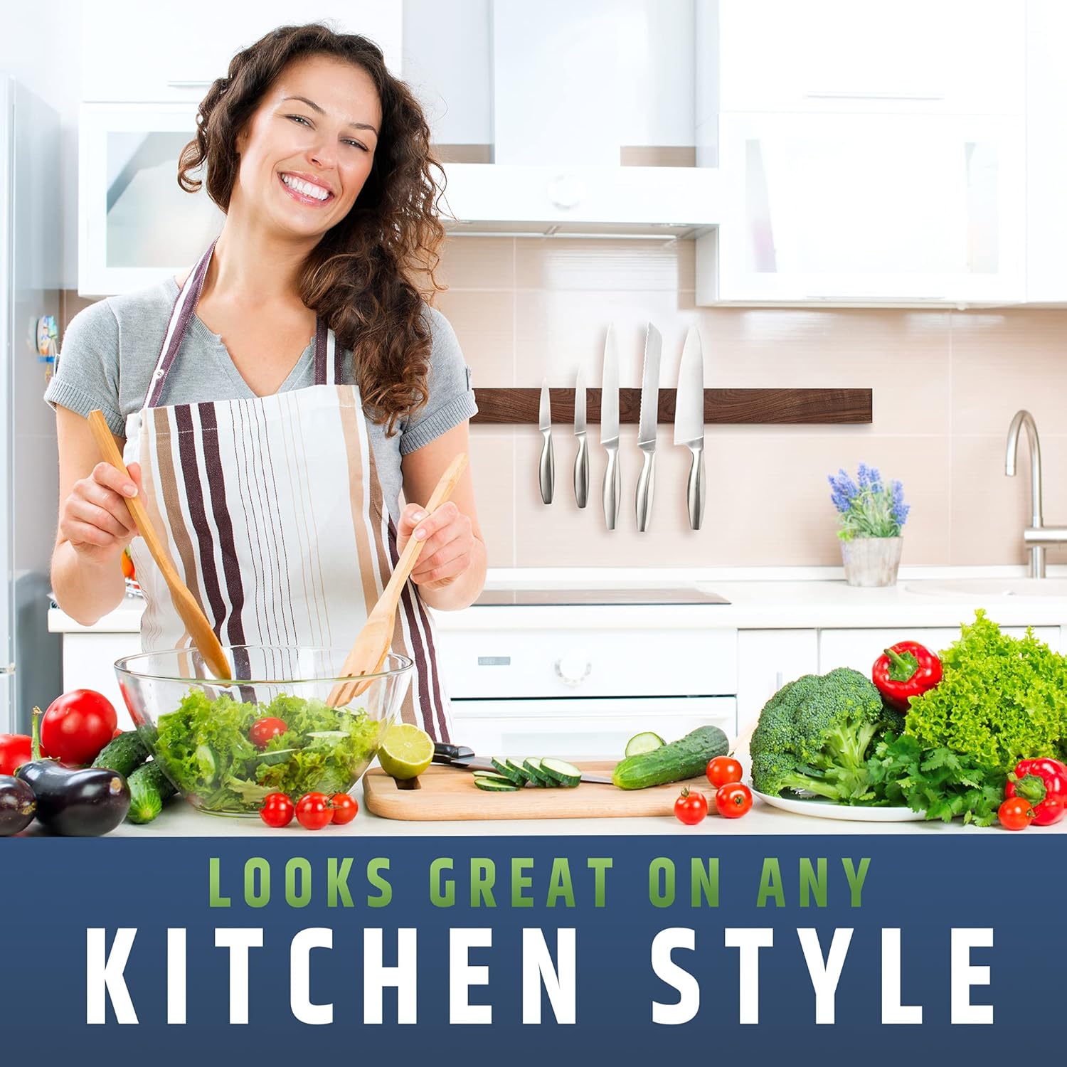 - POWERFUL NEODYMIUM MAGNETS: Our upgraded 24" walnut wood knife bar features heavy-duty magnets that never lose their strength. The even magnetic force across the bar securely holds knives while allowing easy release with a gentle tug. The magnets are hidden inside the wood so they will never rust.