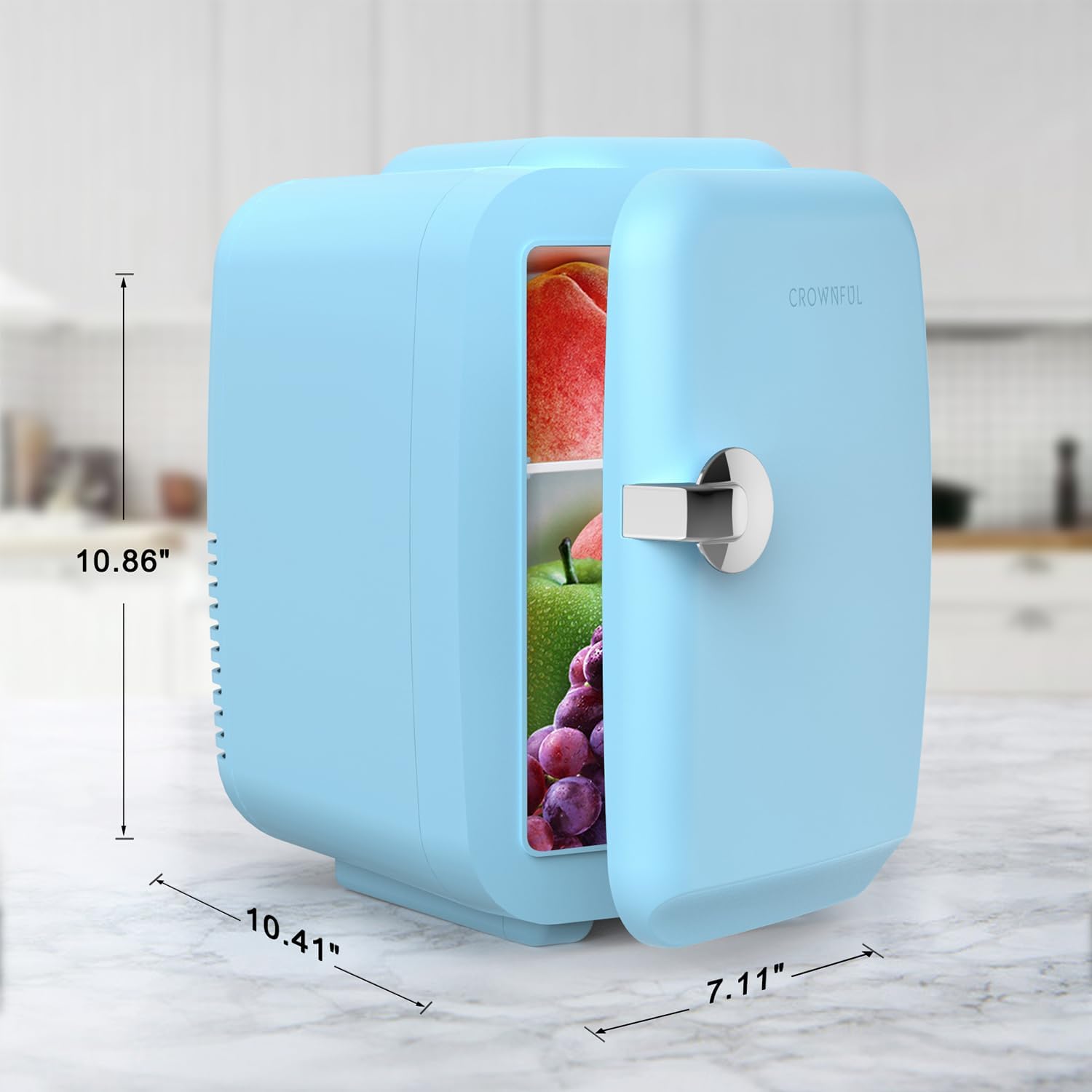 - [Compact and Portable] The Crownful mini fridge has a 4-Liter capacity that can store up to six 12 oz. soda cans. The interior size is 5.33x5.64x8.09 inches. It comes with a convenient carry handle and a detachable shelf, making it simple to transport. Excellent for use in bedrooms, offices, dorm rooms, road trips, boats, campgrounds, and more