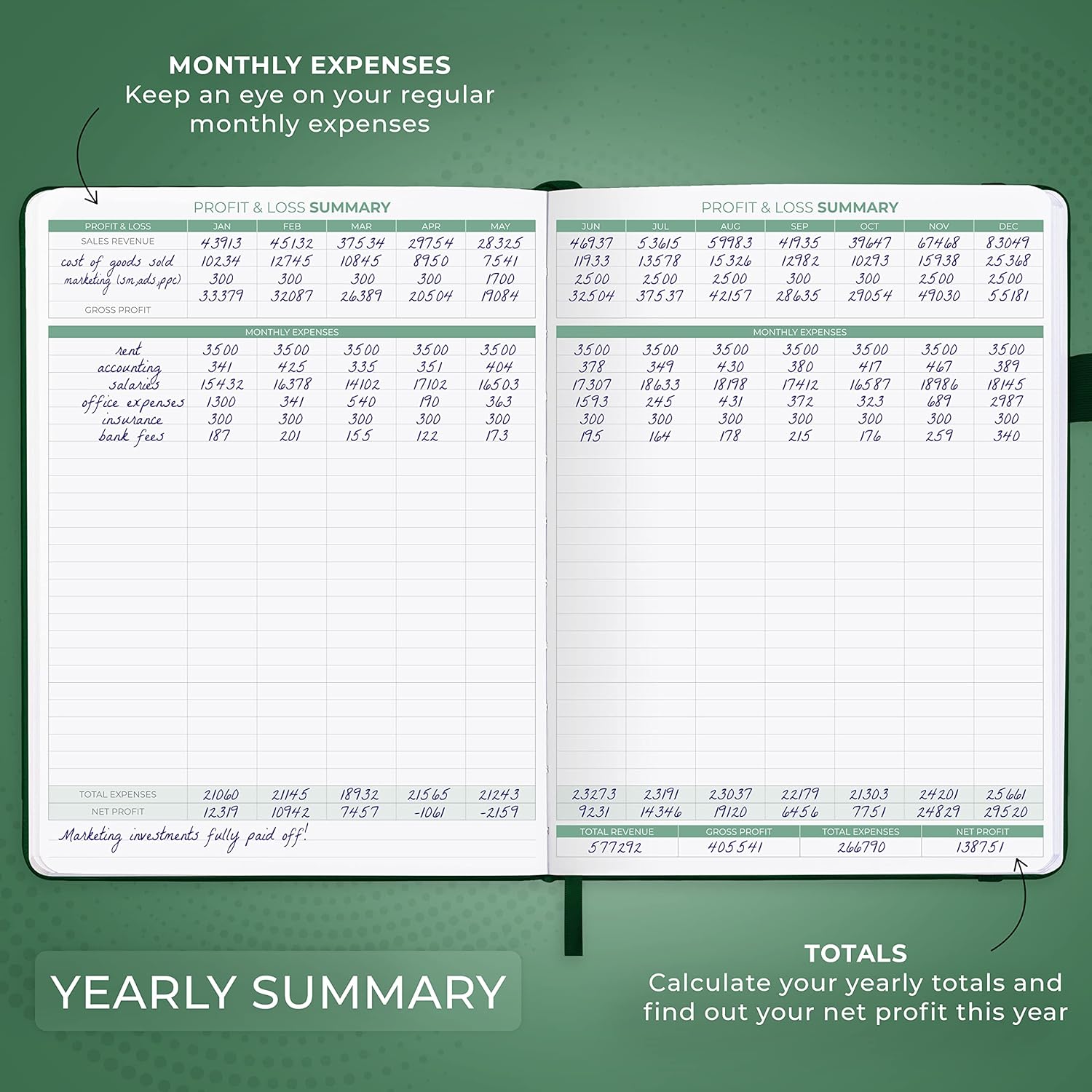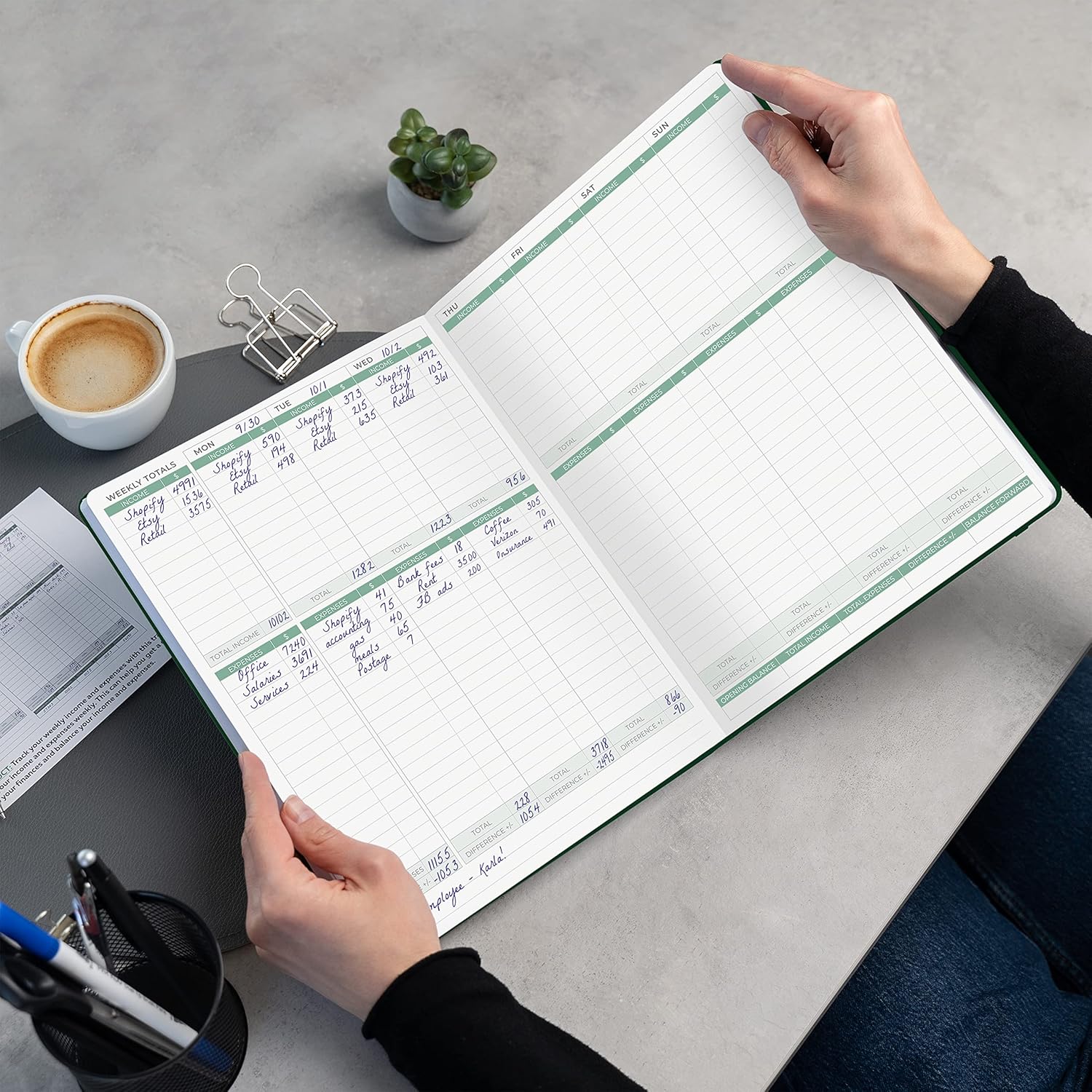 - 2 FULL YEARS OF STRESS-FREE ACCOUNTING: This accounting book is undated and lasts 2 years and has 225 pages, including 106 weekly views, 2 annual summaries, empty note pages, and, at the back, a spacious pocket for receipts.
