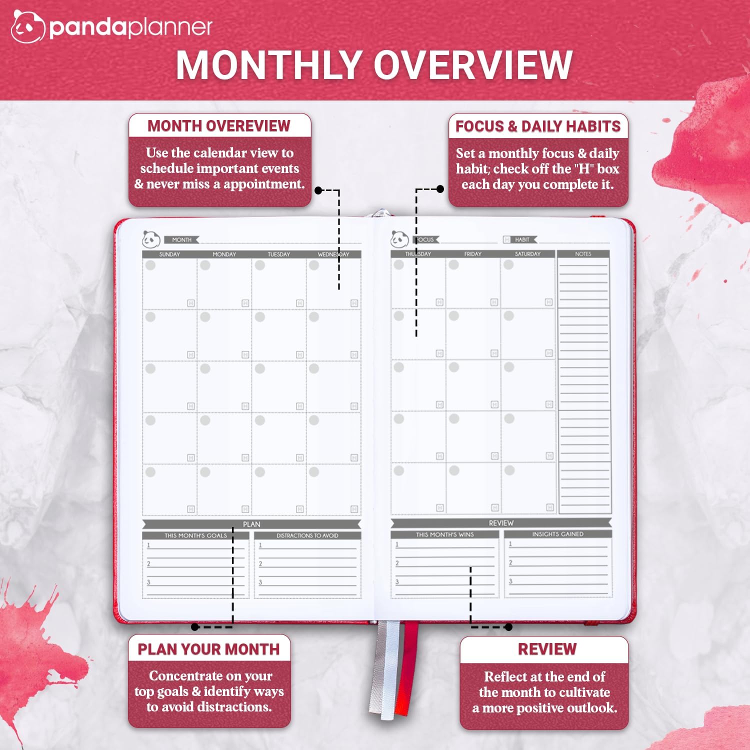 Panda Planner Classic Daily Planner 2025-2026 – Undated Productivity Planner & Hourly Schedule Notebook – Day Planner for Focus, Goals & Organization – Raspberry