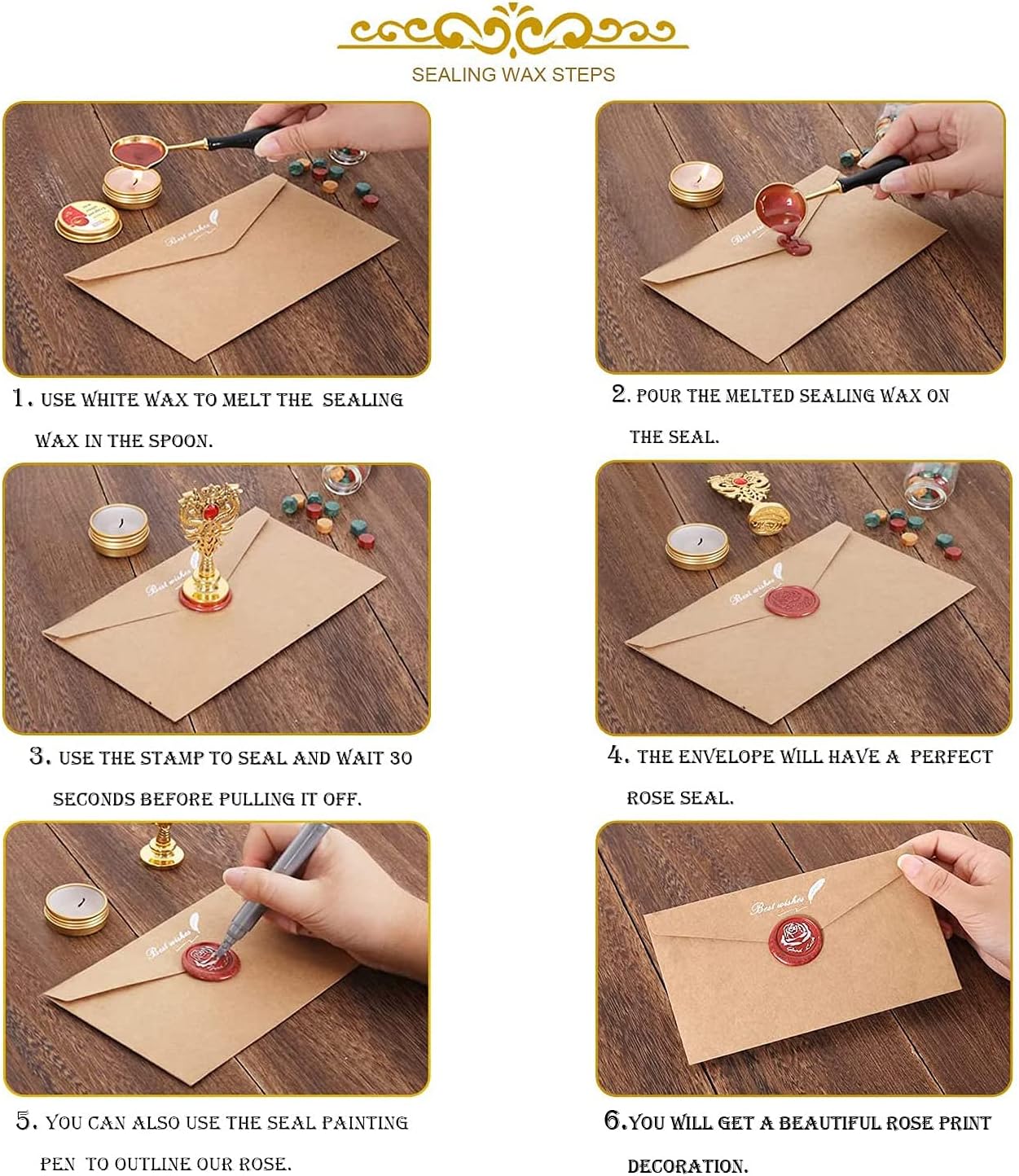 - 【quill wax seal set】: The wax seal stamp is made of high-quality brass head and crown metal dragon pattern, with rose engraving on the stamp. The lacquer wax comes in 3 colors and is equipped with Seal painting pen. It is an ideal choice for decoration, embellishment, invitations, envelopes, postcards, and gift seals.