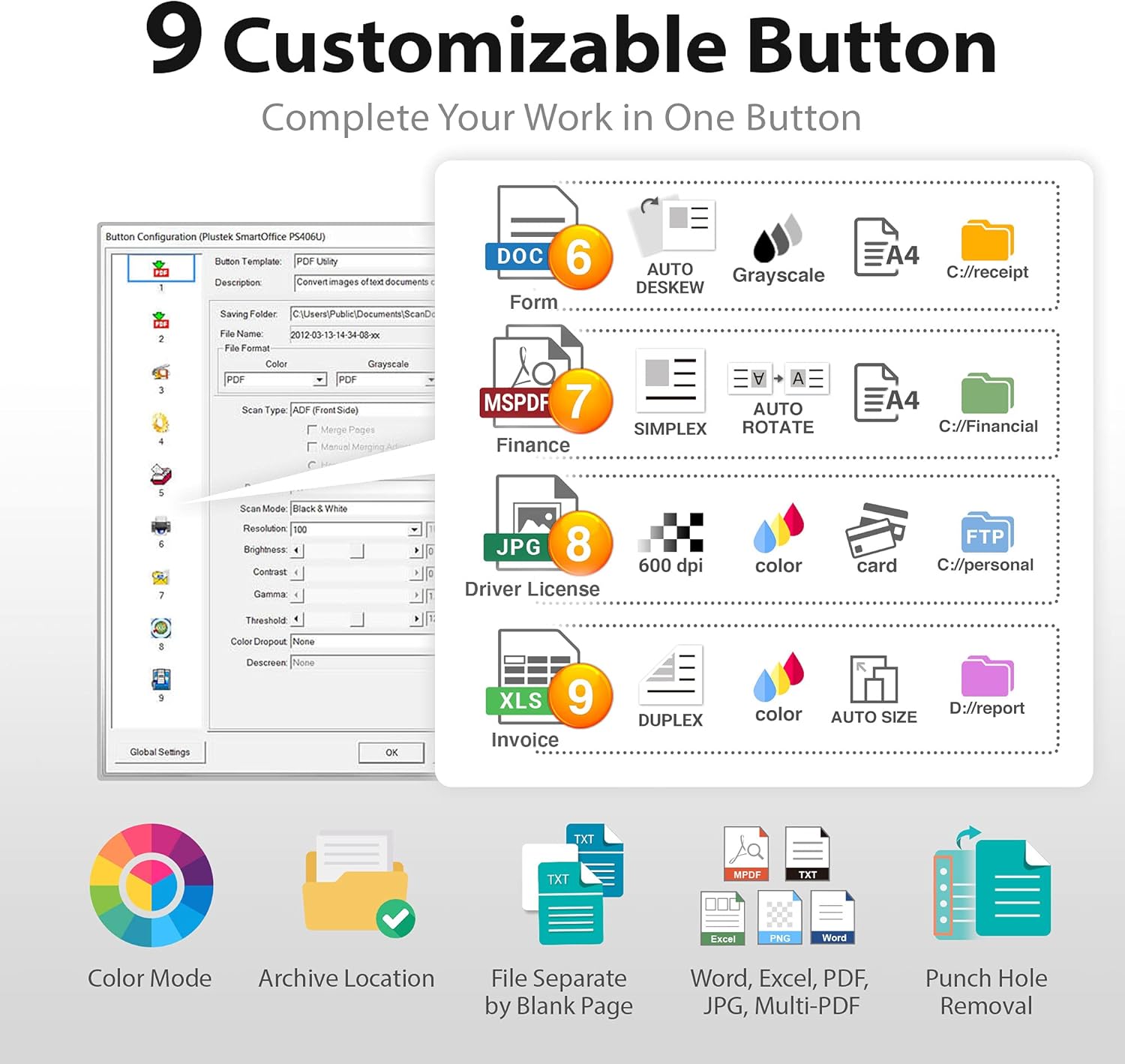 - 【One Touch Workflow】: Customizable scan button configuration, one button to digitize your document with all pre-set profiles, including file format, color format, image adjustment and saving destination. Efficiently sharing document to your colleagues.