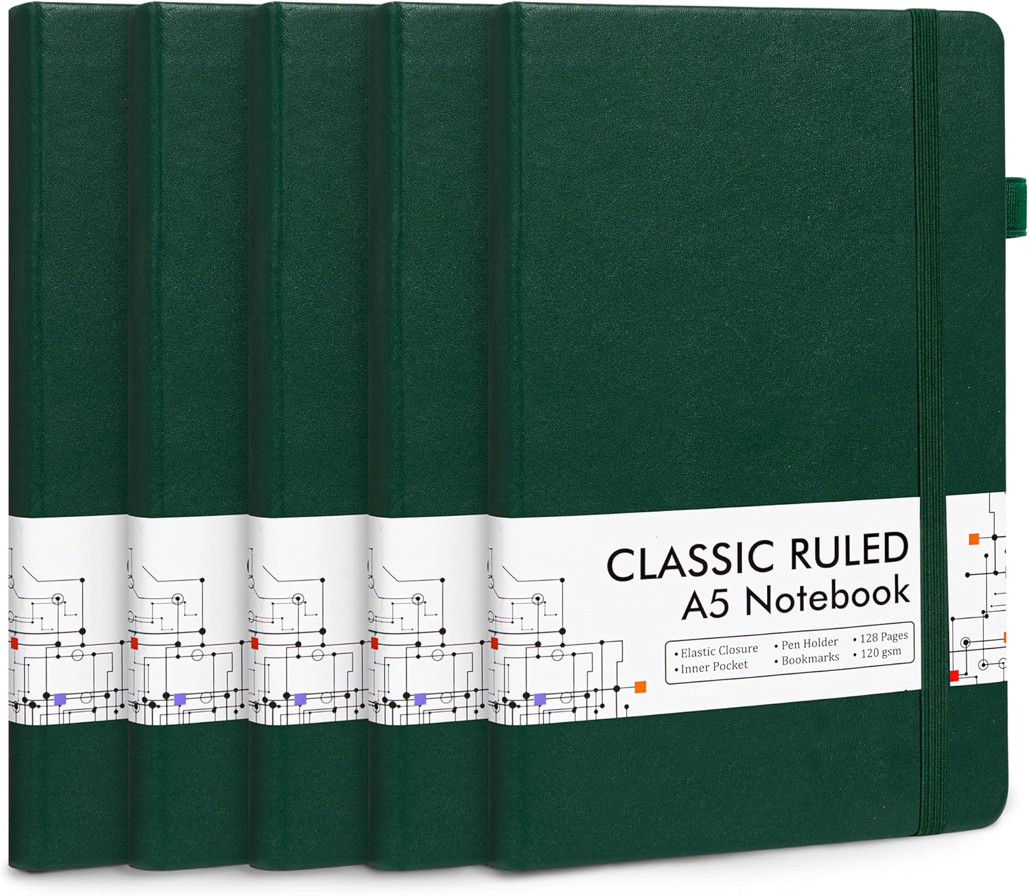 feela 5 Pack Journal Notebook Bulk for School, Hardcover Business Notebooks Classic Ruled Lined Journals with Pen Holder for Work Note Taking, with 5 Black Pens, 120 GSM, 5.1”x8.3”, A5, Dark Green