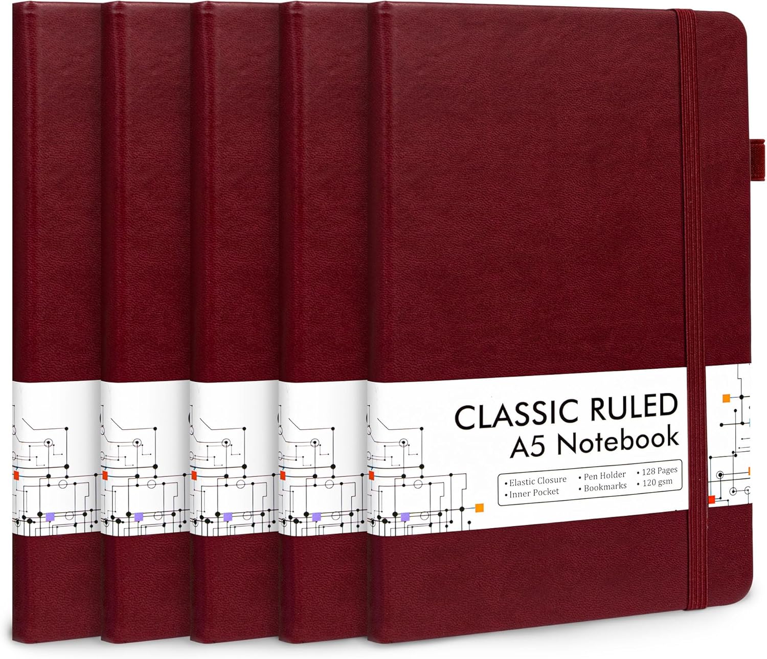feela 5 Pack Journal Notebook Bulk for School, Hardcover Business Notebooks Classic Ruled Lined Journals with Pen Holder for Work Note Taking, with 5 Black Pens, 120 GSM, 5.1”x8.3”, A5, Wine