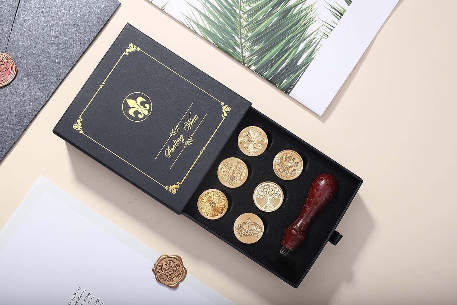 - ăHigh Quality MaterialăWe carefully check before shipment to ensure that every part is perfectïŒThe removable head is made of high quality brass, with delicate and clear patterns engraved on the golden luster surface, which is comfortable to the touch, easy to replace and install. The handle of the wax seal stamp set is made of high-quality wood, sturdy, durable and soft to handle.