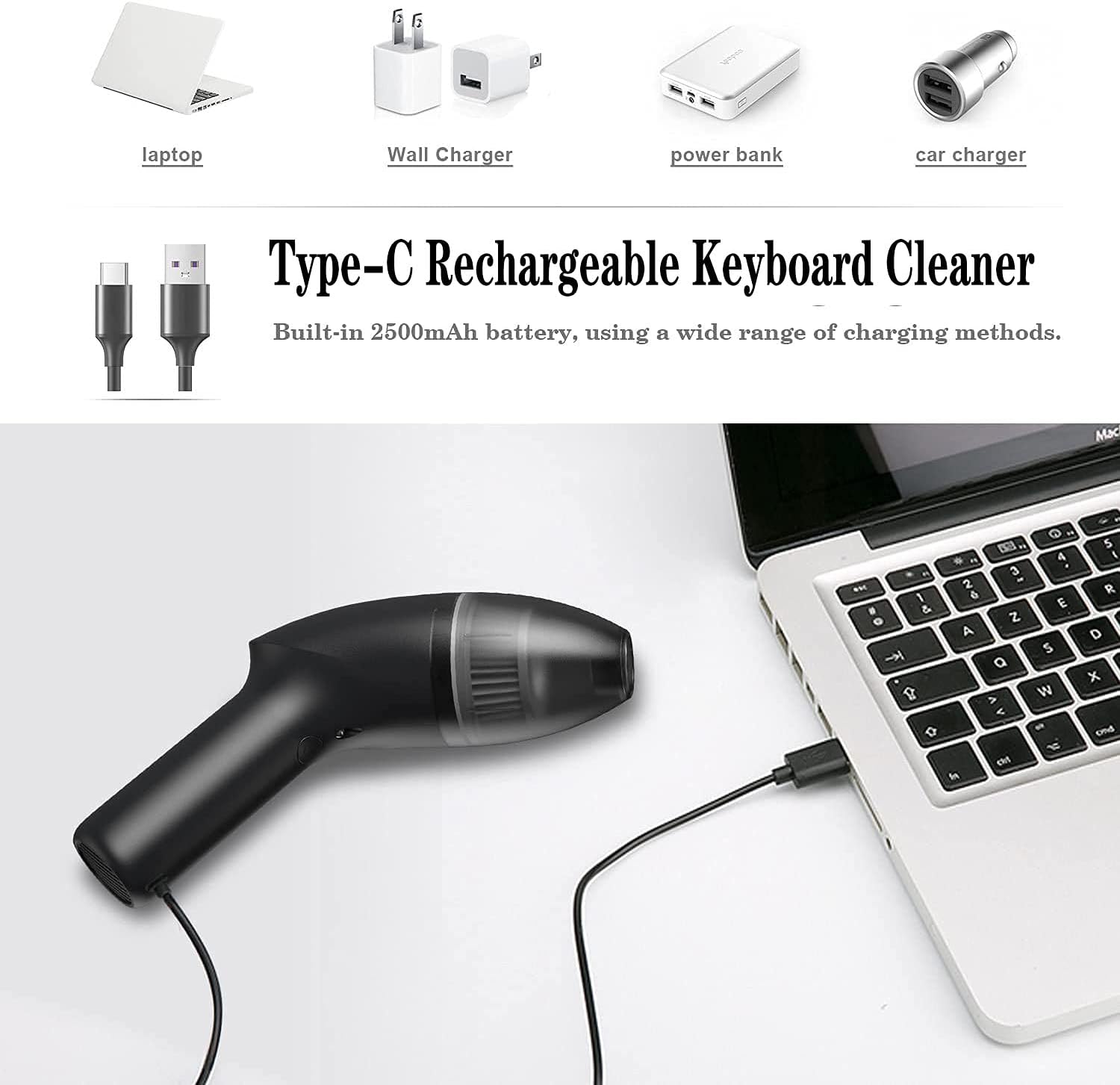 - ăWhat IncludedăPackage including a mini vacuum cleaner, a charging cable (adapter not included), a 2-in-1 nozzle, a mini brush,and a carrying bag.
