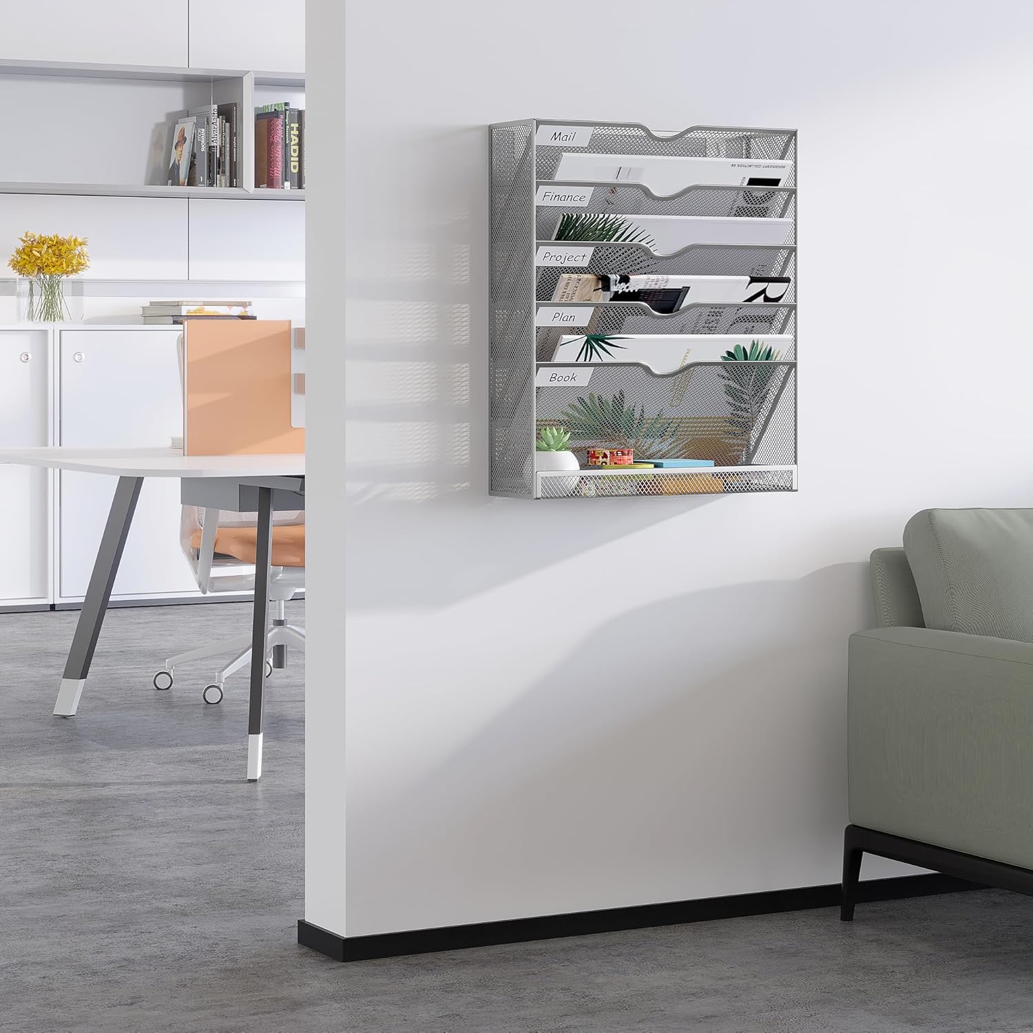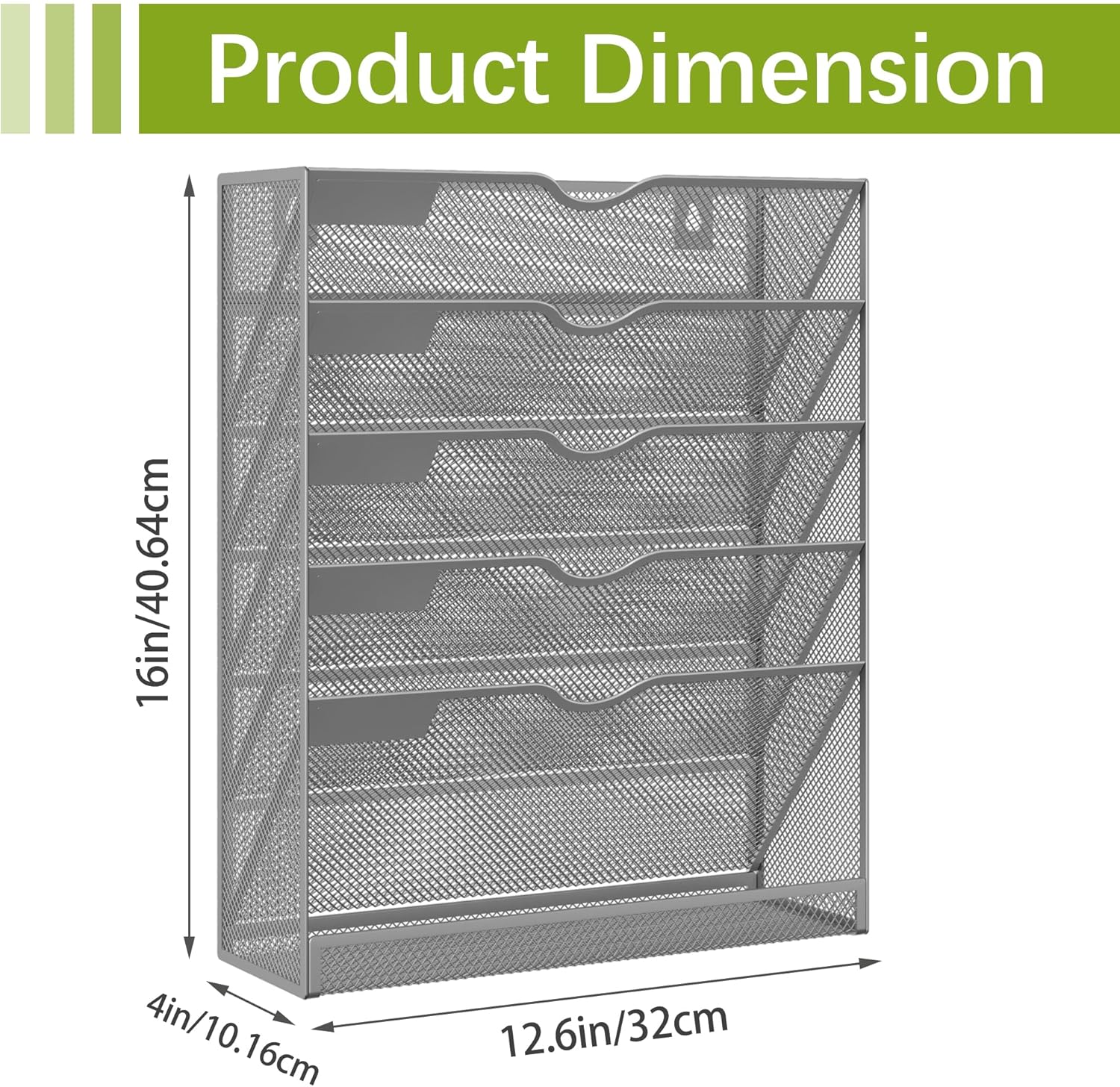 EasyPAG 5-Tier Wall File Holder, Mesh Hanging Folder Organizer with Classify Label, Versatile Desk File Organizer for Office Home, Vertical Wall Mounted Mail Sorter, Sides Closed, Silver