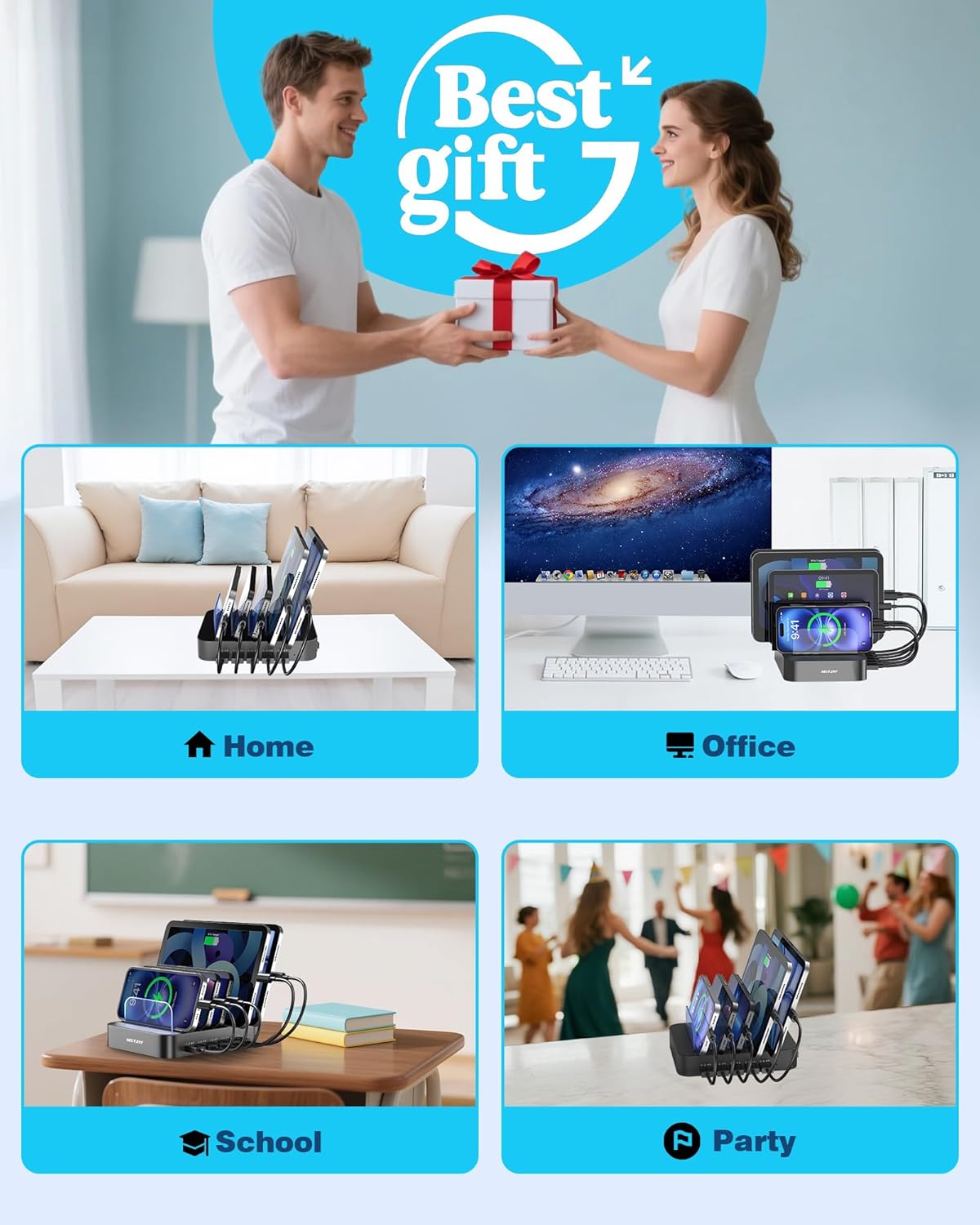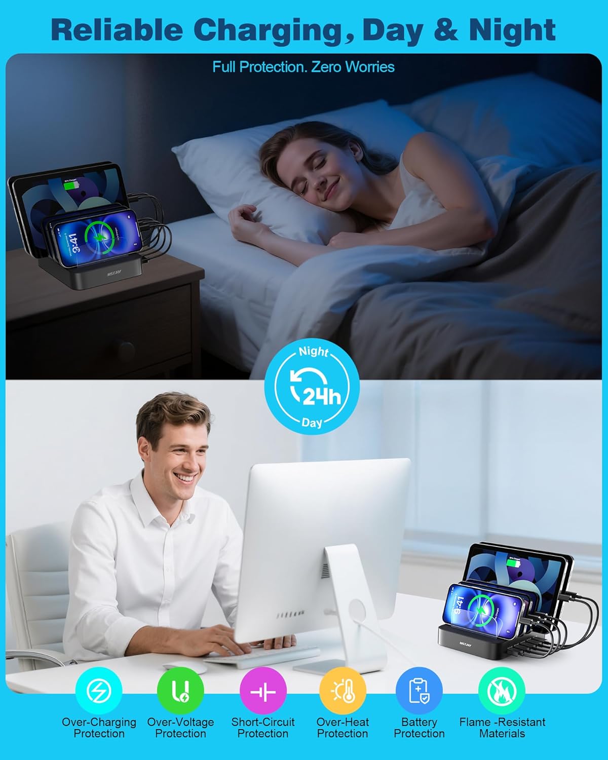 - 【Fast and Smart】This charging station for multiple devices will charge your smartphones, tablets up to 80% than other USB-A charger station with 2.0A or less. Our multi port charging station will automatically detect your devices and adjusts voltage for minimal charging time.