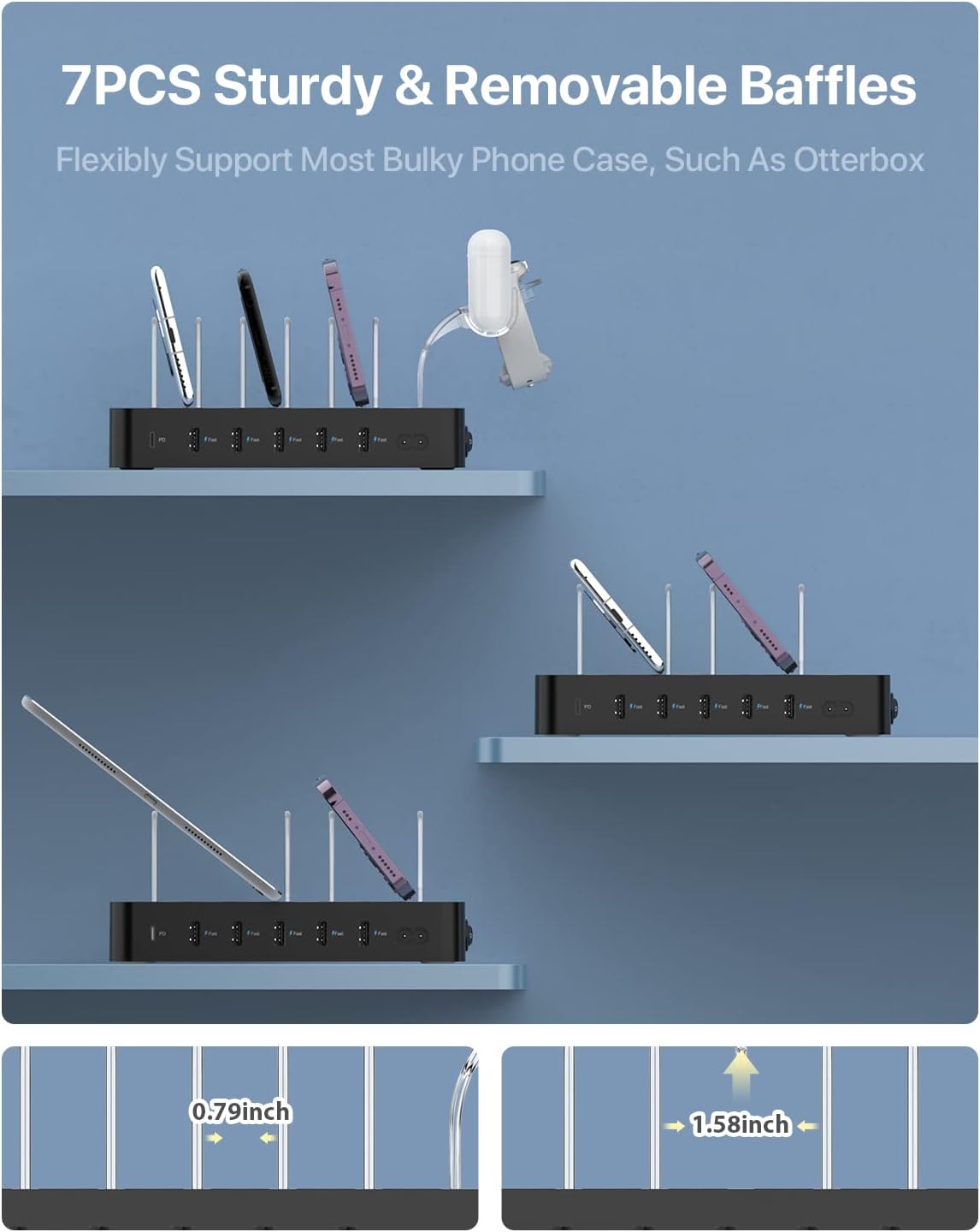 - ăRemovable Dividers & Upgraded 2-In-1 HolderăWith 7pcs Sturdy and removable Dividers,7pcs for phones and tablets,1pcs 2-in-1 new holder for i watch & Air-Pods charger,0.79inch wide space to support more bulky phone cases,like Otterbox.(The i Watch Charger is not included).