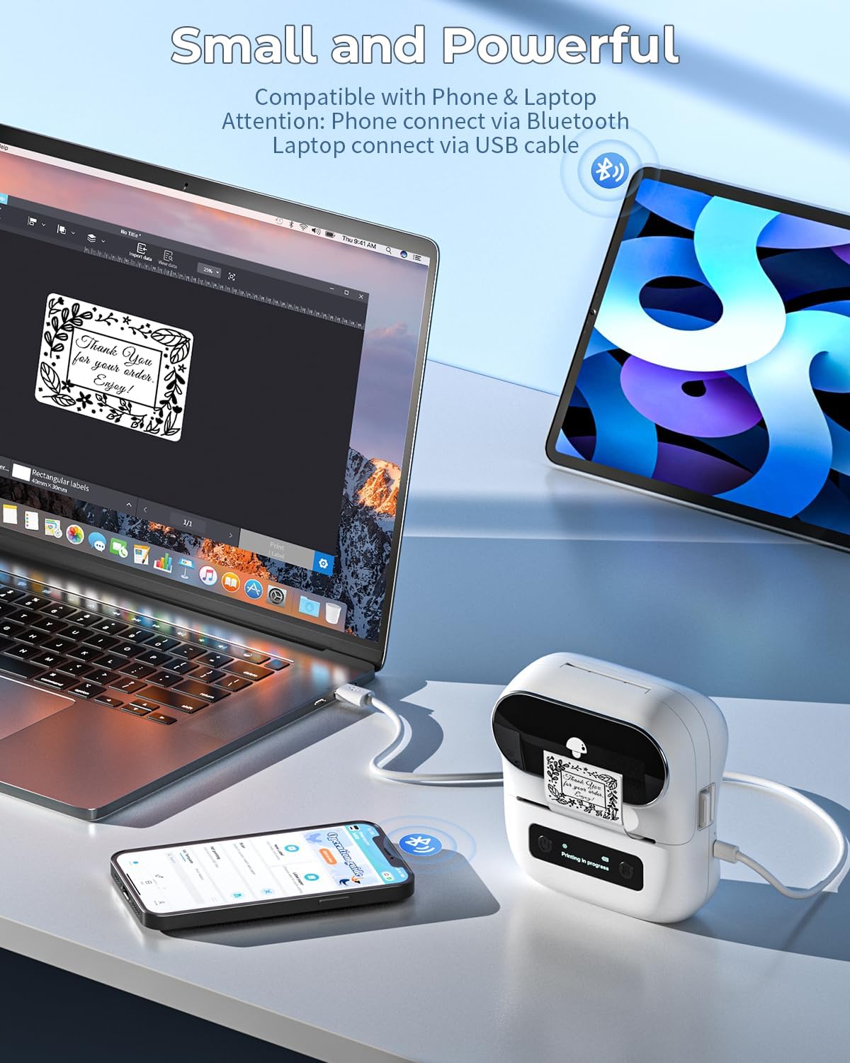 - Bluetooth Wireless Connectivity - Experience the freedom of wireless printing with the Phomemo Bluetooth-enabled label maker. Easily connect via Bluetooth on the App "Print Master" with your phone, tablet for seamless label creation on-the-go. NOTE: The Phomemo M220 label maker only supports connection via Bluetooth with phones and tablets on the App; laptop connection should be via USB