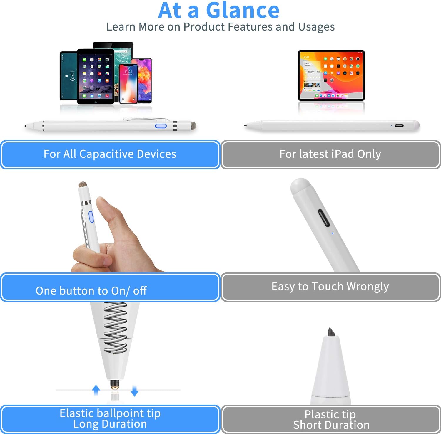 2-in-1 Active Stylus Digital Pen with 1.5mm Ultra Fine Tip for iPad iPhone Samsung Tablets, Work on Touchscreen Phones and Tablets,Good at Drawing and Writing, White