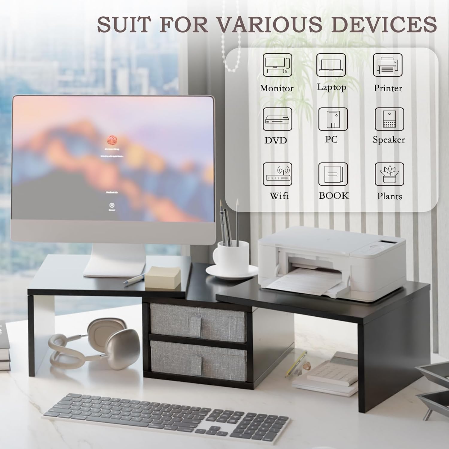 - 【Versatile Stand for 2 Devices】Dual monitor stands for 2 monitors, laptops, printers, computers.This 3 shelf desk shelf is designed to accommodate all your office equipment. Its versatile design ensures it fits your workspace, making it an helper for your home and office.