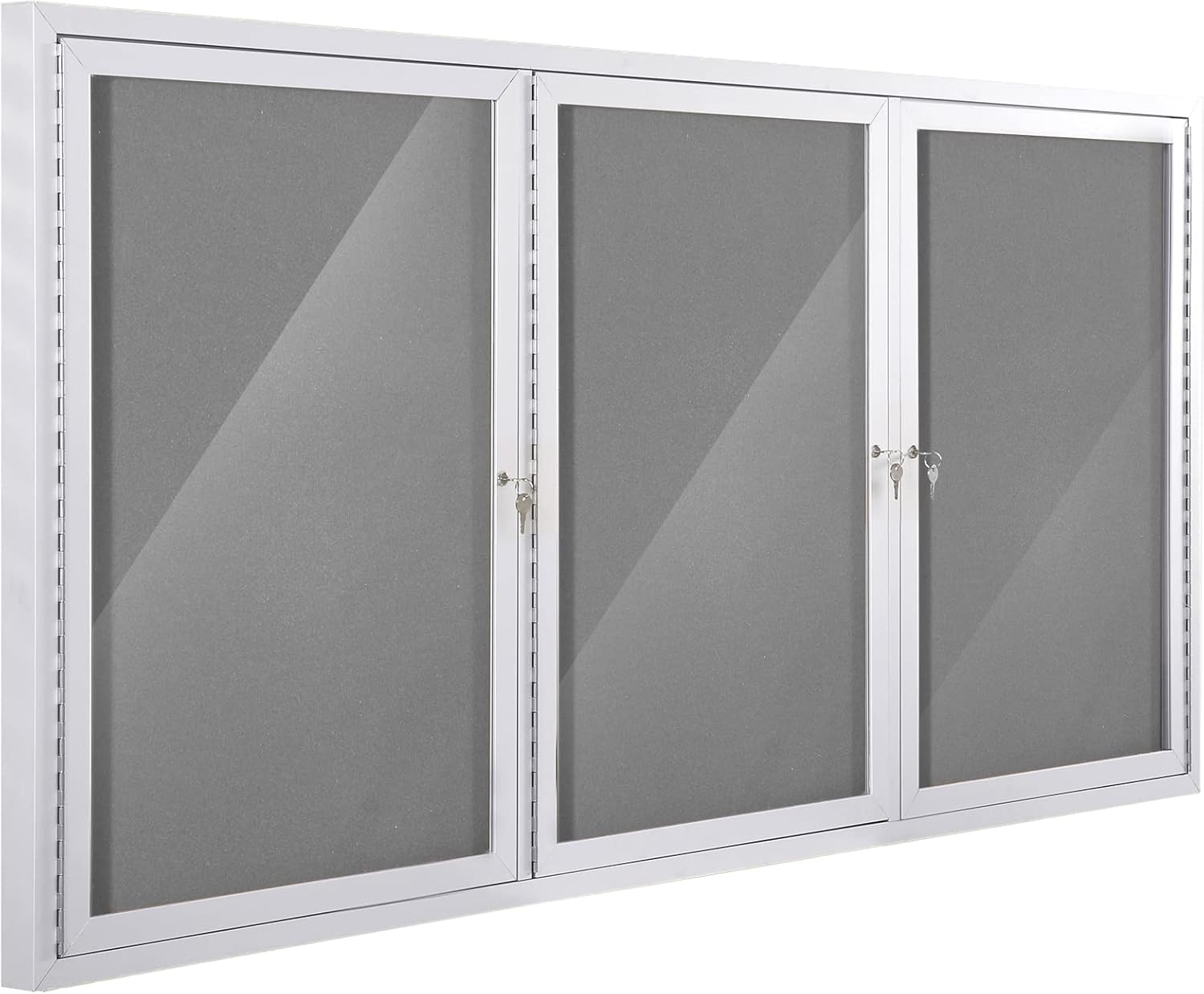 SWANCROWN Weather Resistant Enclosed Bulletin Board Gray Fabric Displays Boards Wall Mounted Notice Cabinet with Three Locking Doors, 70x36 inches