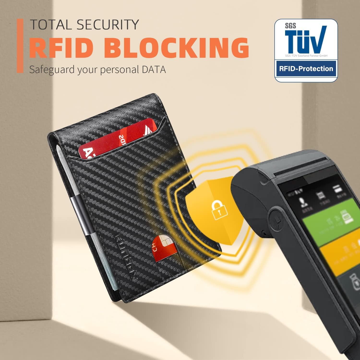 - ππ ππ ππ§ππ’-ππ‘πππ ππππππππ - this slim wallet for men equipped with German Instiute Certified RFID Security technology, a unique metal composite, engineered specifically to block 13.56 MHz or higher RFID signals to protect the valuable information and privacy