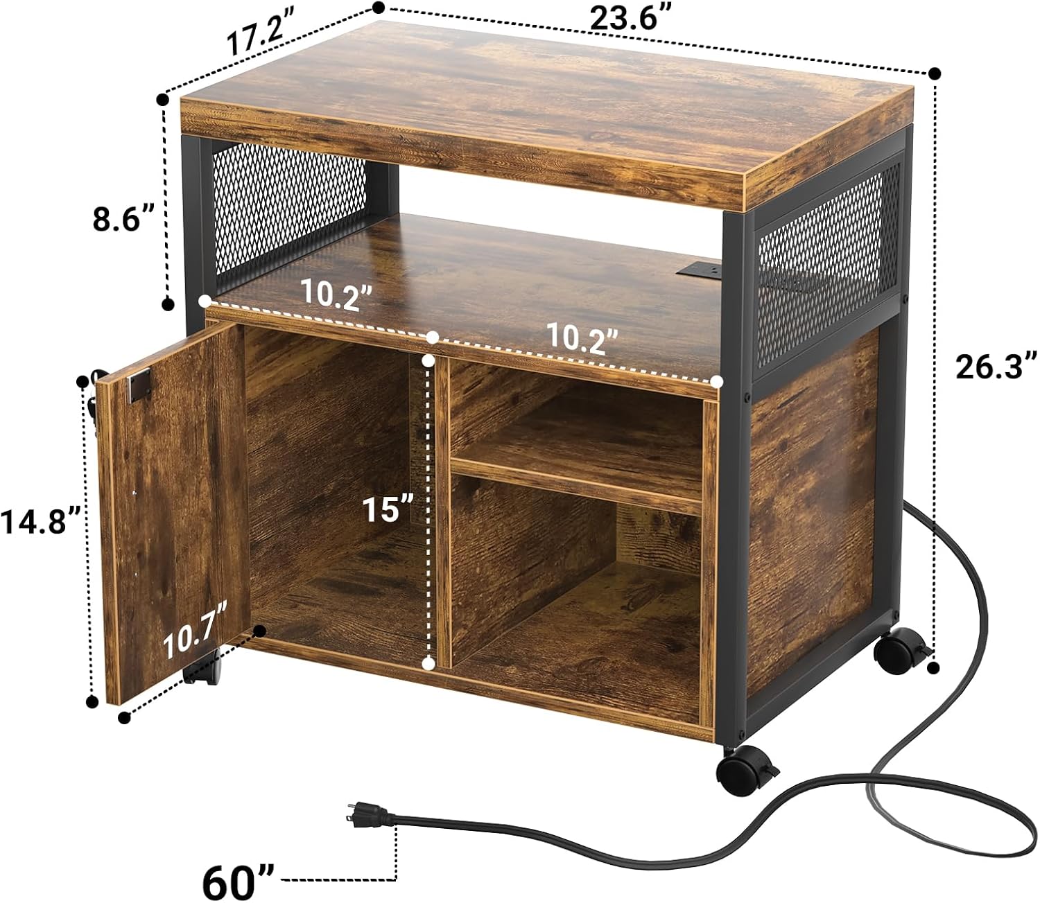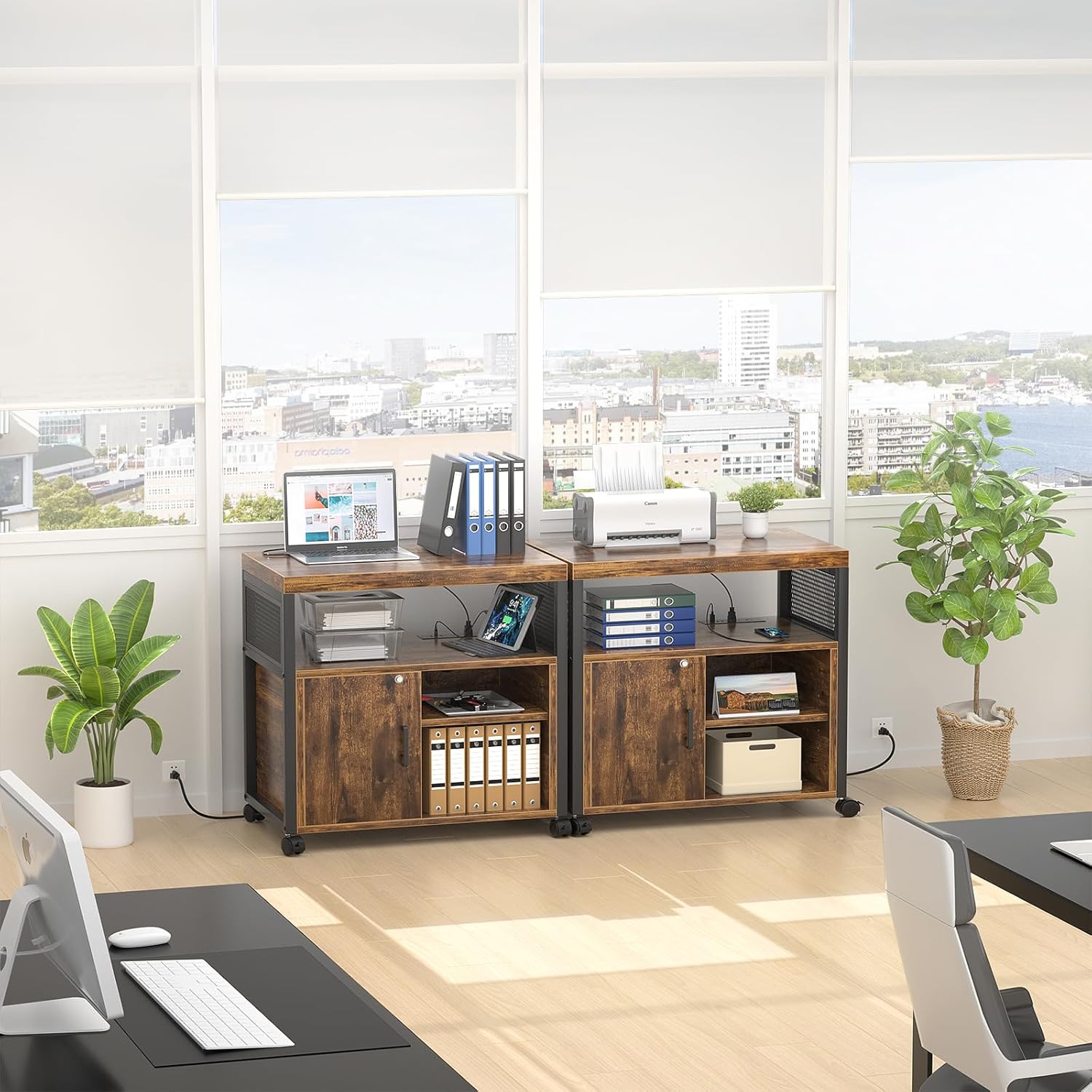 - 👍【Multifunctional】 This rolling printer stand featured with a lockable door, which allow convenient file access and add security that keep your business private. The two open shelves is great to storage and display for binders, folders, books, furnishing articles or decor. You can also adjust the shelves height as your different needs.