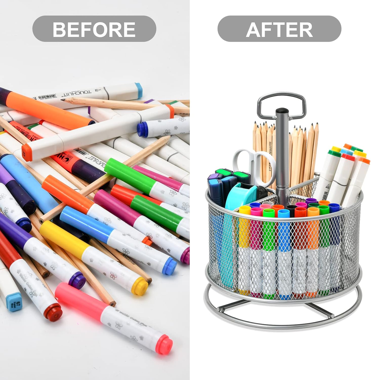 - ăMultipurpose Desktop Organizeră: This rotating storage organizer is perfect for pencils ,cosmetics, bathroom necessities, toiletries and even kitchen utensils.Try it in your craft room, playroom, laundry/utility room and even inside bathroom cabinets or under the sink; Store extra office supplies like painting pens, correction tape,scissors ,TV Remote and more; Even headphones or a charger will no longer be lying around in the future! Maximize your vertical space and keep your desk clear