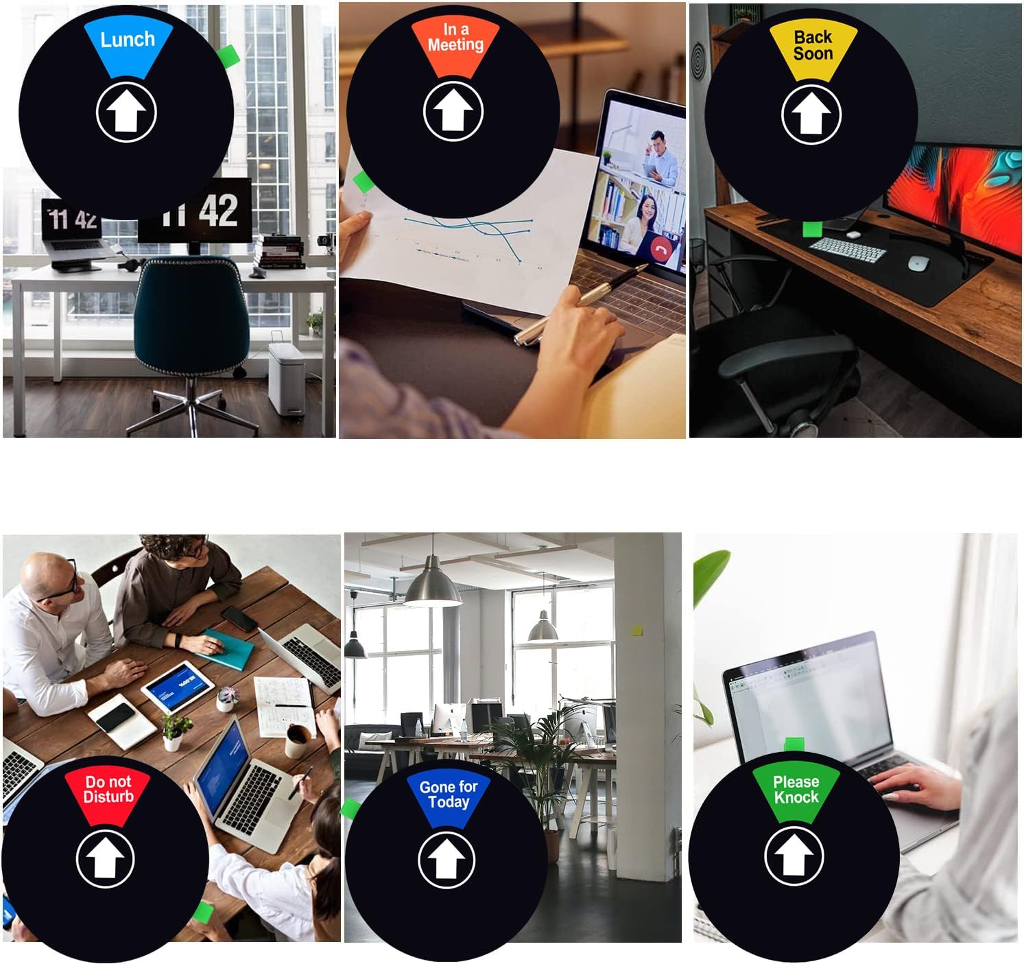- Easy to switch between Do Not Disturb, Please Knock, In a Meeting , Back Soon, Lunch and Gone for Today, but the status will remain unchanged unless you change it manually because inside the sign there are small magnets that will keep the status stay in place