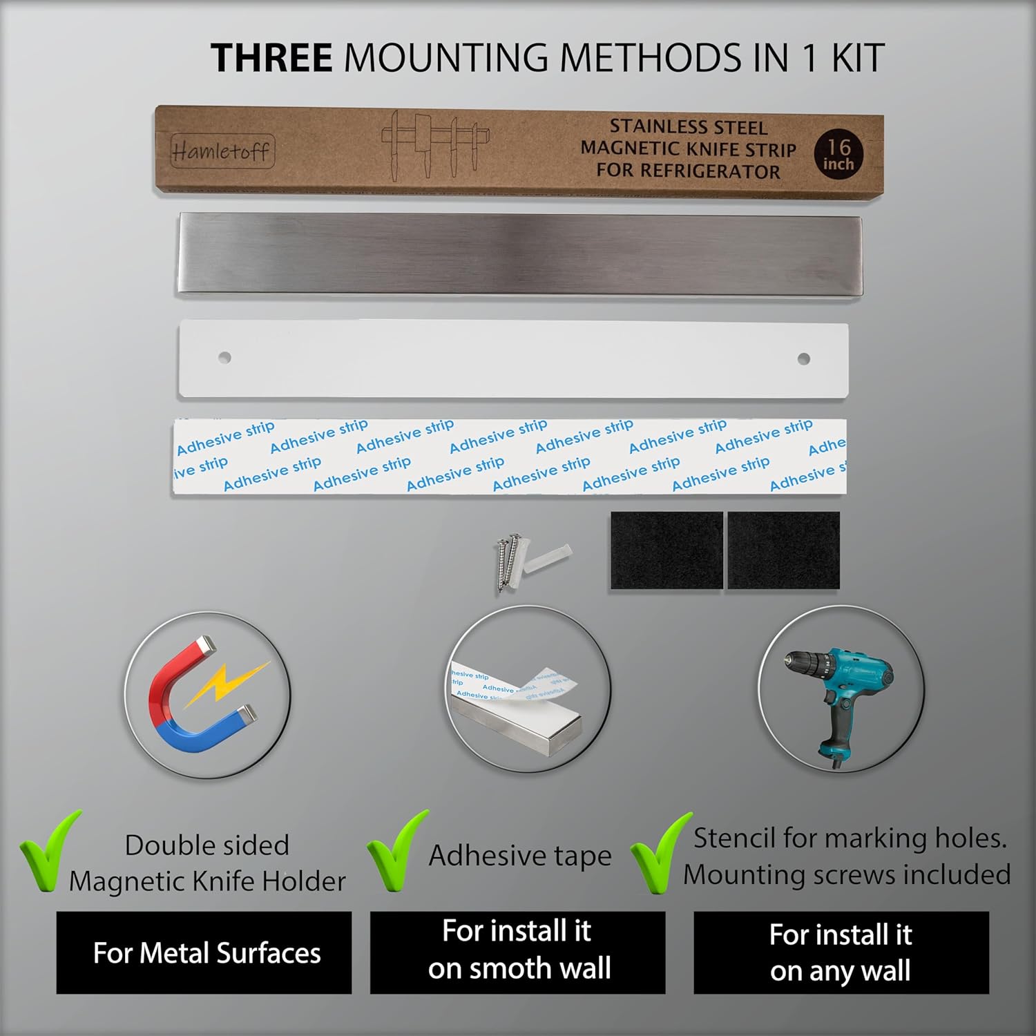 - You can also install the magnetic knife wall holder on any wall surface. The kit includes strip adhesive 3M designed to install magnetic knife holder on the wall no drill on a smooth wall surface. There are screws also included in case you need to drill holes and mount the magnetic strip on any surface. You choose the method of installation that is the most convenient for you depending on the smoothness of your wall