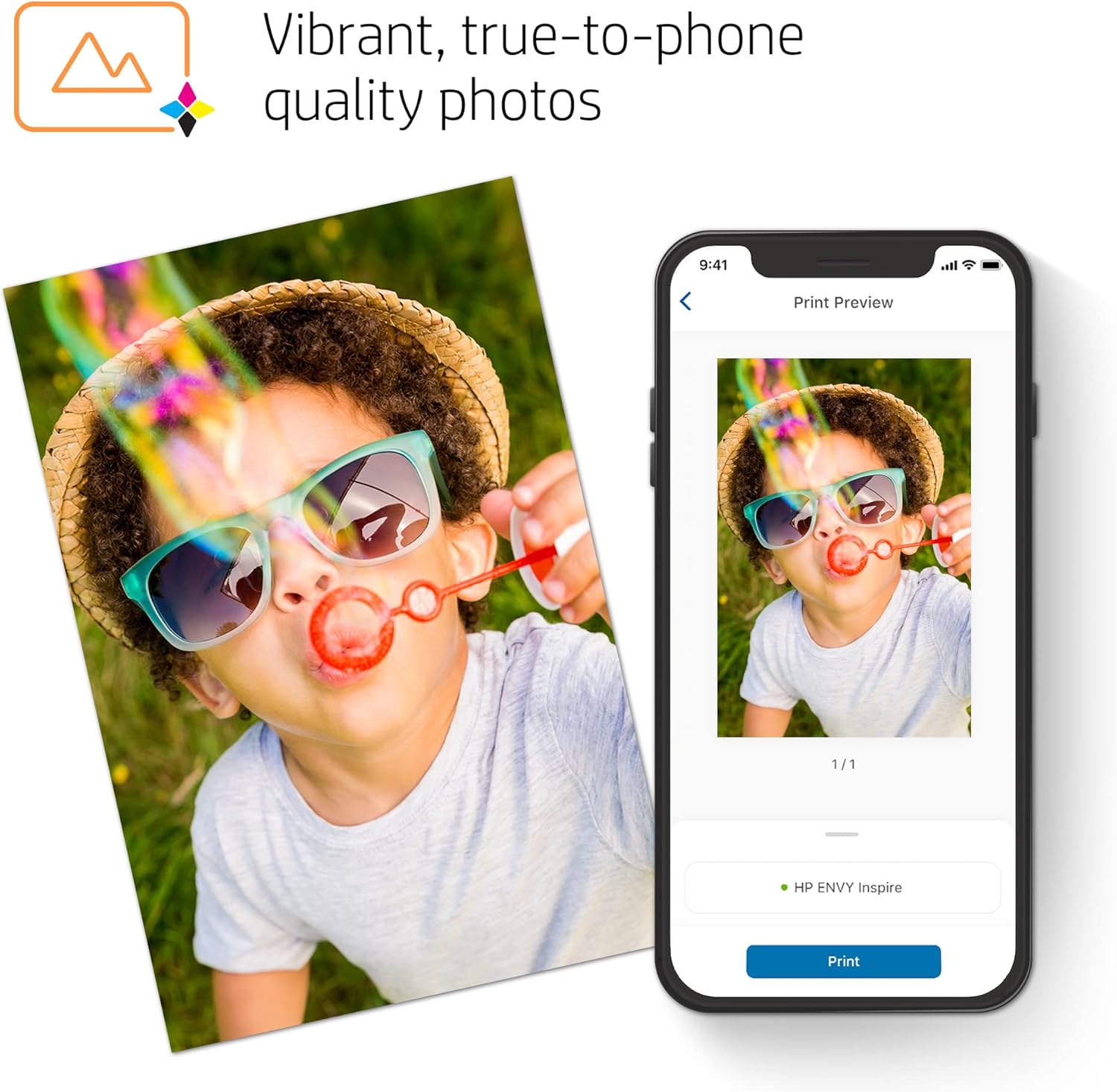- VIBRANT PHOTOS β Photos that look as vibrant as they do on your screen with true-to-phone quality prints, plus custom photo features in the HP Smart app. HP 5x5" square and 4x12" panoramic photo paper sizes are optimized for the HP ENVY Inspire series