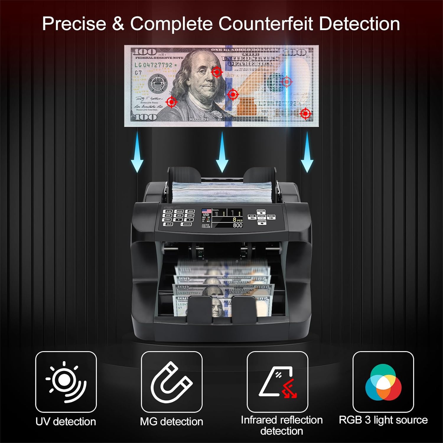 - [Precise Detection protect small business] UV/MG/IR/RGB counterfeit detecting technology allows this bill counter machine check the bills in Magnetic, Infrared, Ultraviolet, Dimensional, Thickness, Security Line and different light source.Guard small business owners from loss.