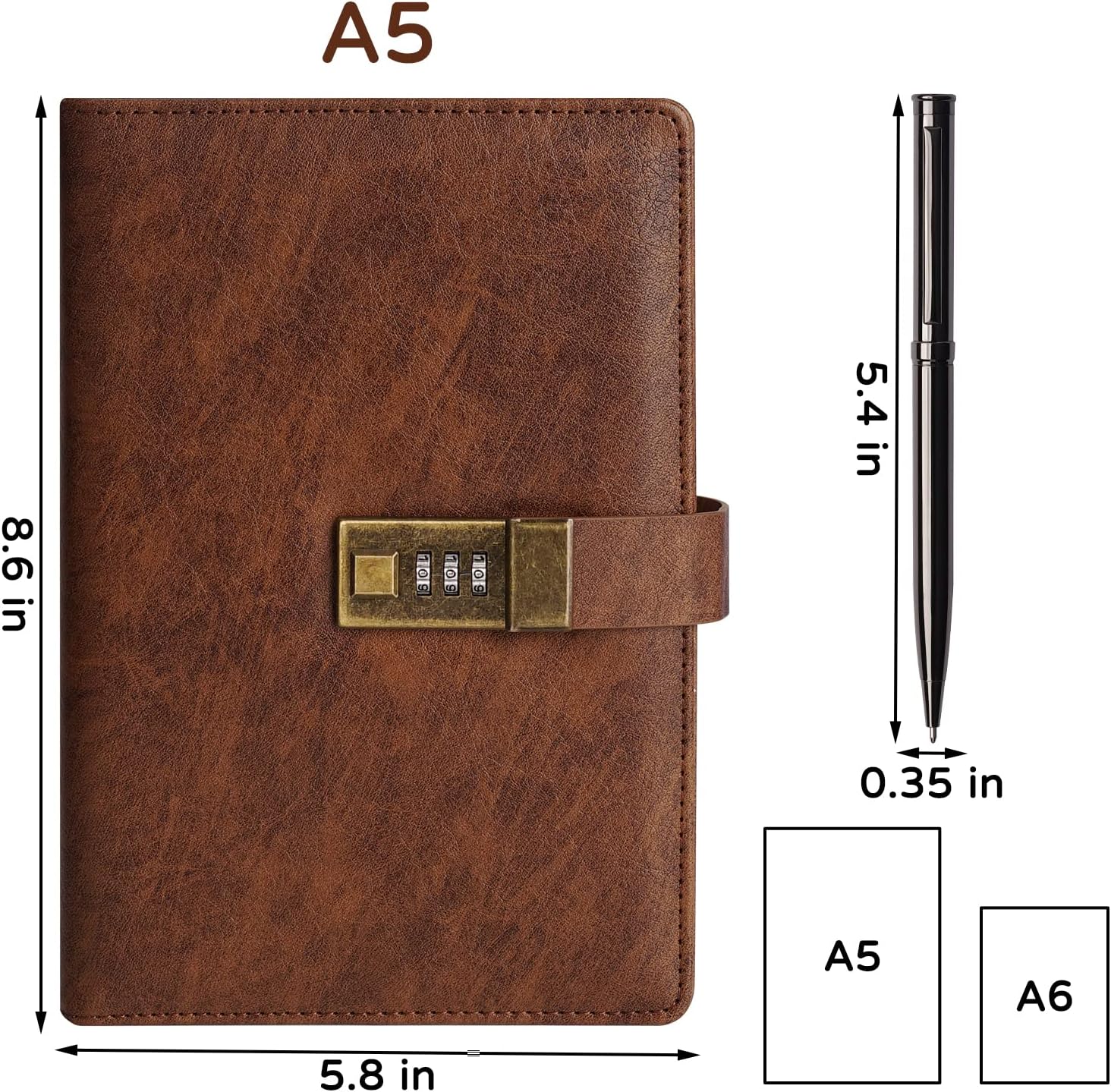 WEMATE Diary with Lock, A5 PU Leather Journal with Lock 240 Pages, Vintage Locks Journal Password Notebook with Pen, Locks Diary Planner Organizer for Men and Women, 8.6x5.8in Brown